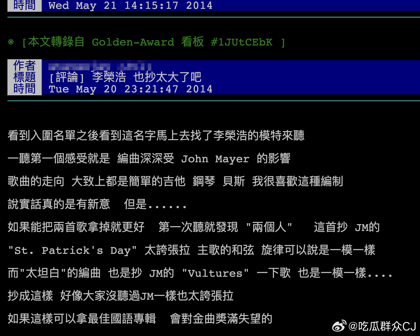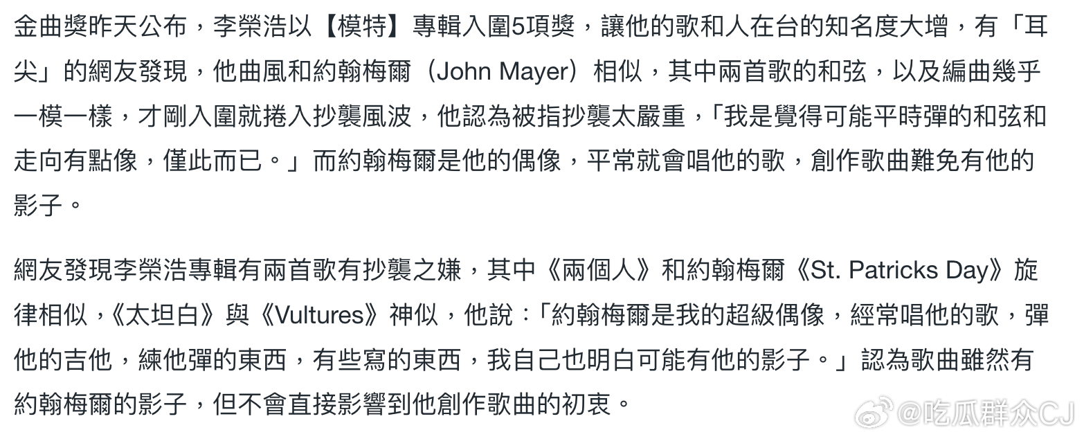 早在2014年李荣浩入围金曲奖成为当届大黑马的时候,就有台湾网友指出他的编曲深受John Mayer:《两个人》疑似抄袭John Mayer的《St. Patrick's Day》,“主歌的和弦,旋律可以说是一模一样”,而《太坦白》的编曲“也是抄 JM的《Vultures》”。对此李荣浩的回应是,“John Mayer真的是我的超级偶像,我平常可能也有一点他的影子吧,可能是因为听太多了,但不会直接影响到我的创作,我觉得抄袭可能有一点点过,可能弹的东西、和弦跟他有点像吧,我觉得可能就仅此而已。”