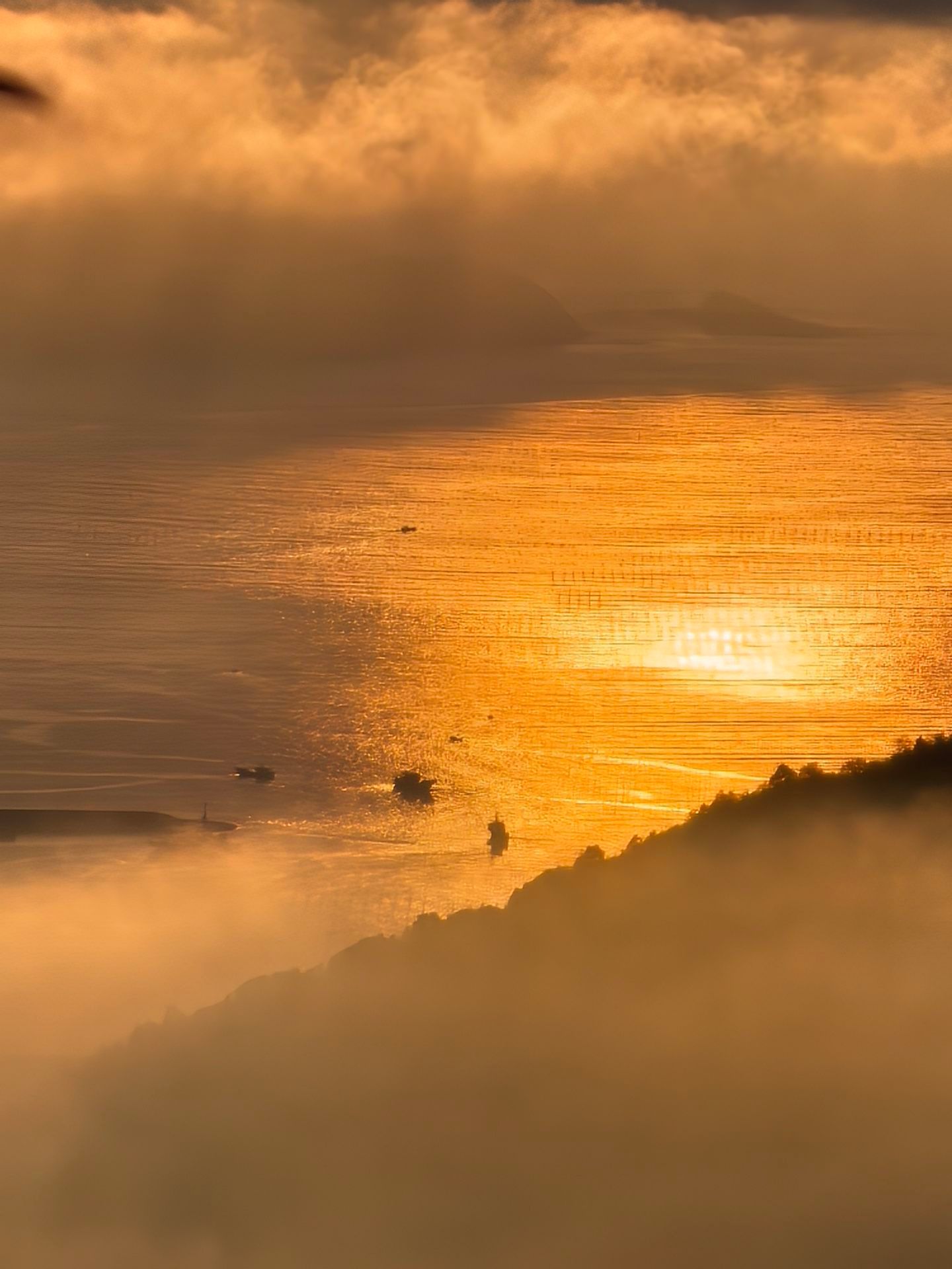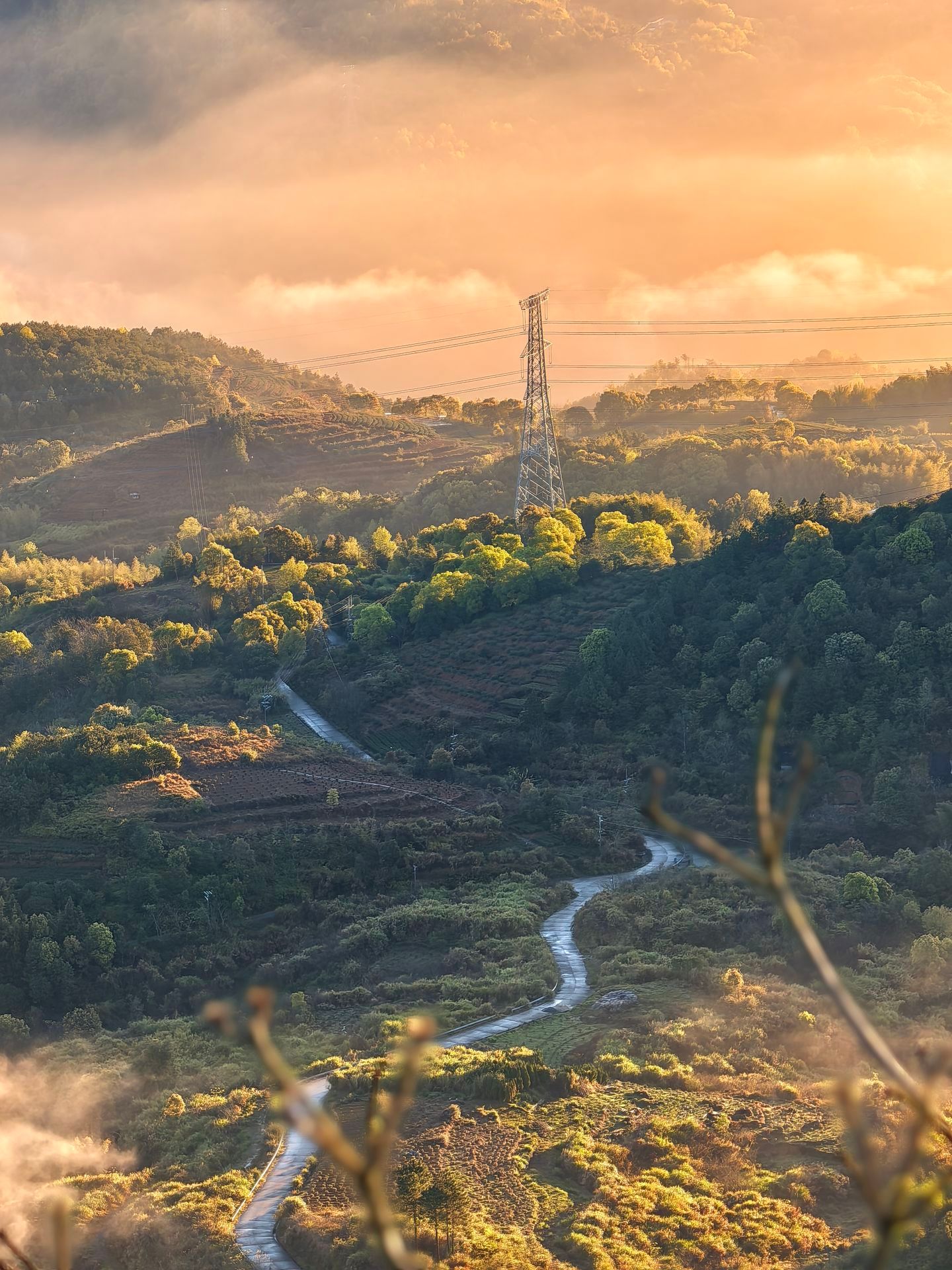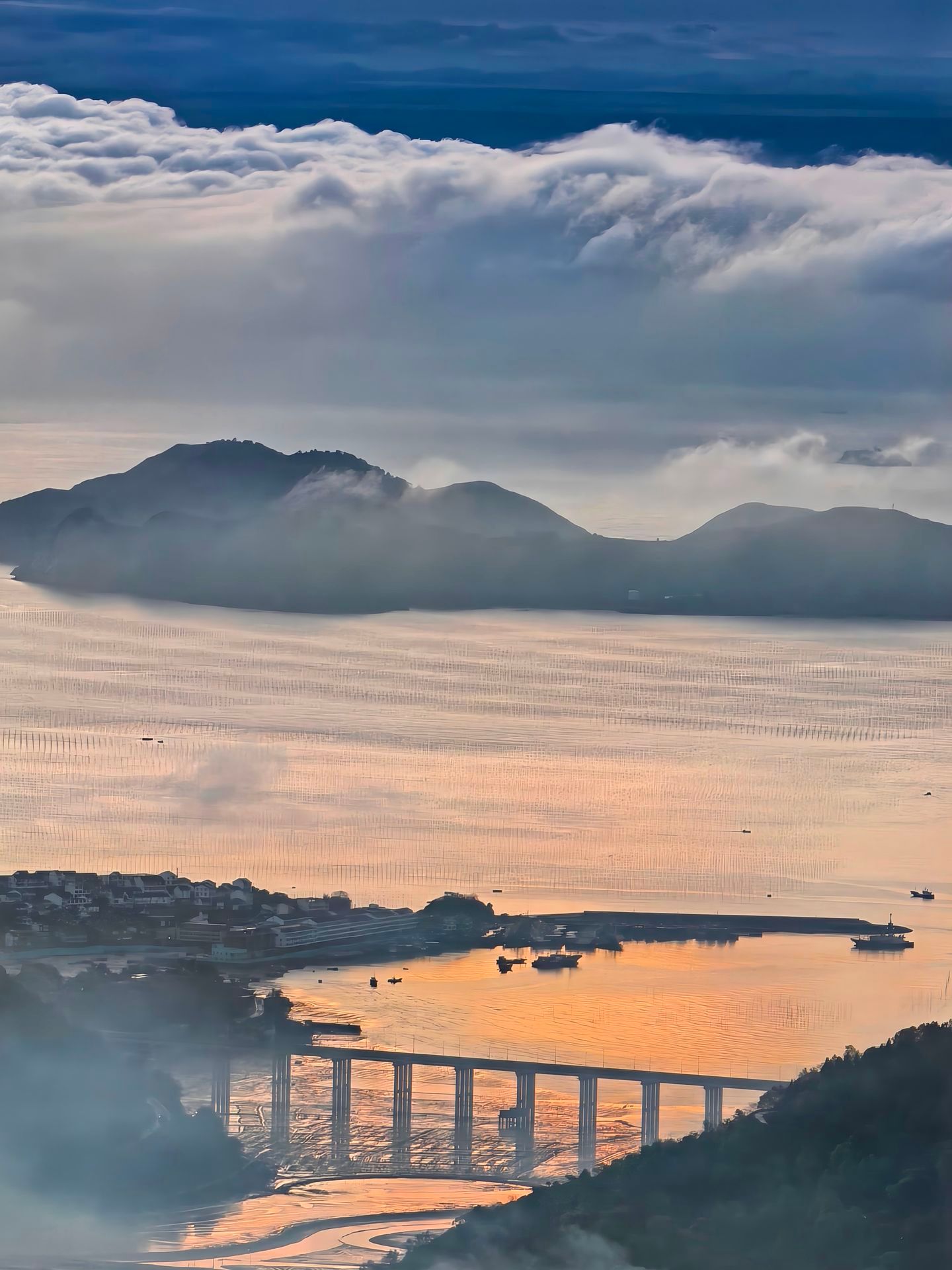 再往上走,枝桠的剪影框住日出的金芒,梯田和电线塔在光影里晕成油画,蜿蜒的小路像大地的掌纹,藏着山野的秘密📸 最惊喜的是海边晨雾,渔船在金色的波光里若隐若现,桥的倒影碎在水面,恍惚闯进了仙境。