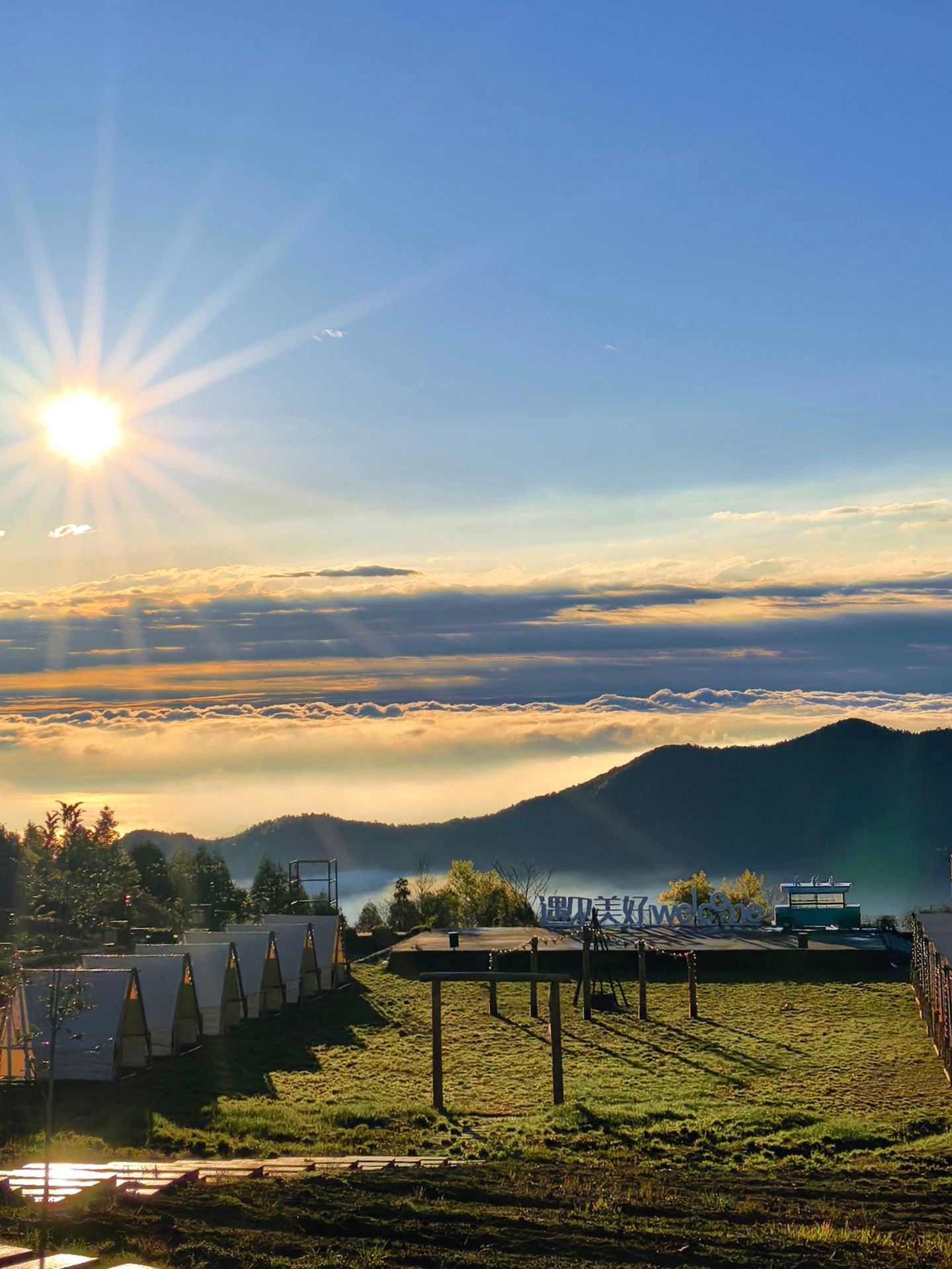第一站撞进云海露营地,白色帐篷错落成诗,草地还沾着晨露的凉。“遇见美好”的标牌在阳光下闪闪发亮,远处的山峦被云海托着,像浮在天边的岛屿☁️ 风掠过耳畔,带着草木的清香,突然懂了古人“春山可望”的心动。