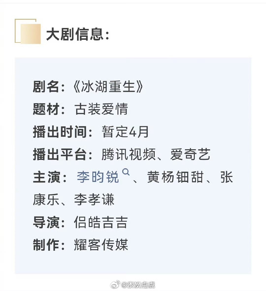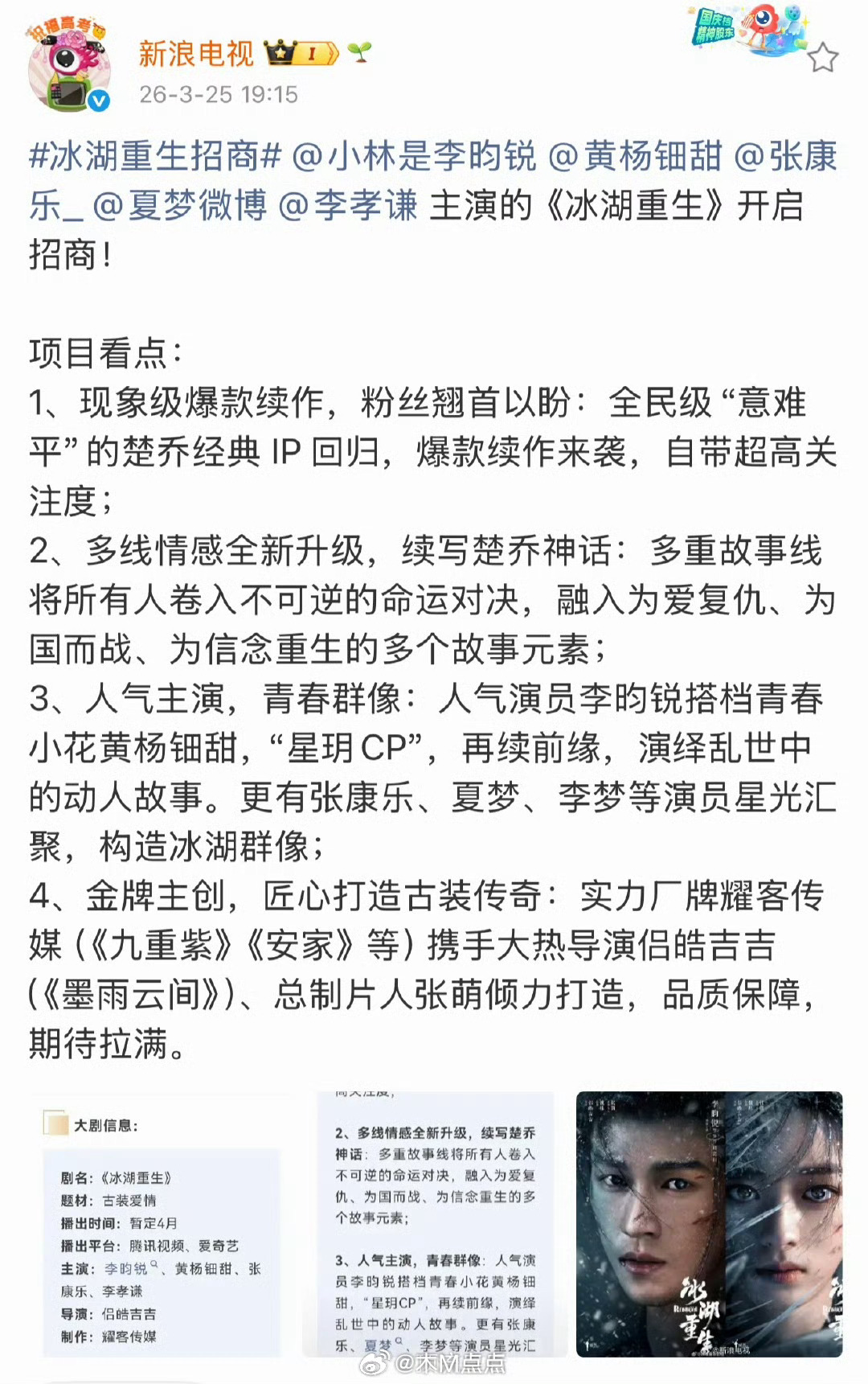 冰湖重生双平台接档逐玉 冰湖重生招商简介,人气主演李昀锐搭档青春小花黄杨钿甜再续爆款,这是要播了吧?实话实说就是黄杨钿甜没有隐退过,不存在复出二字。风波平息后正常营业剧宣。