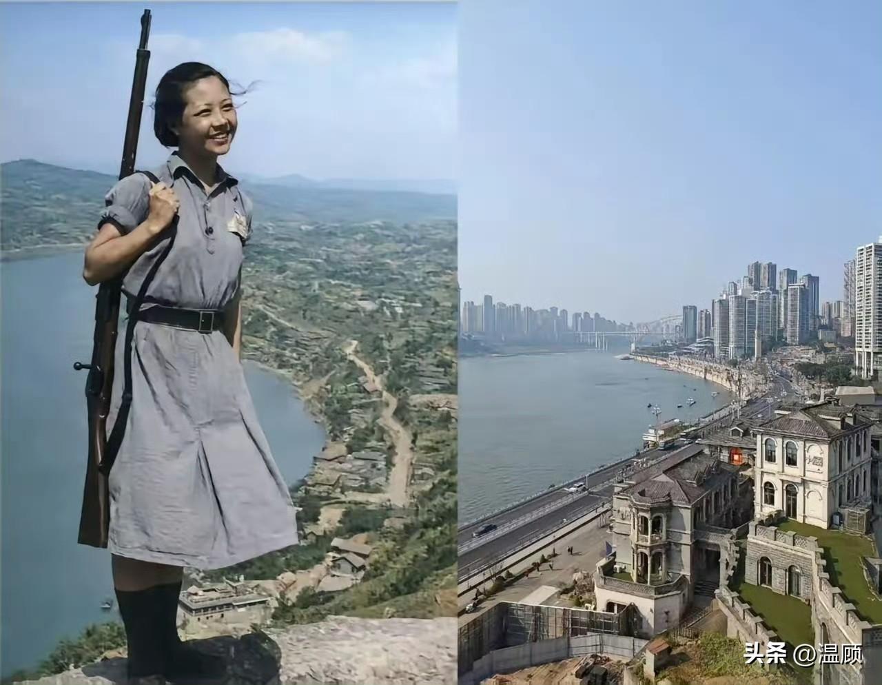 1941:战火中的微笑 照片的左侧,定格了1941年重庆南山的一幕: - 拍摄者是美国《生活》杂志摄影师卡尔·麦登斯,主角是年仅15岁的防空监视队队员陈美瑶。 - 彼时,重庆正承受着日军长达数年的无差别轰炸,她身着浅灰制服裙,将步枪斜扛肩头,站在俯瞰长江的山岗上,笑容明亮而笃定。 - 这张照片登上《生活》杂志后,在西方世界引发震动——它打破了“中国女性只是战争受害者”的刻板印象,让世界看到,哪怕在最黑暗的时刻,中国人依然有直面炮火的勇气与希望。 2026:山河换新颜 照片的右侧,是同一个视角下的今日重庆: - 当年的山岗与村落,早已被林立的高楼、宽阔的滨江路取代;江面的货船、跨江的大桥,勾勒出繁华都市的轮廓。 - 唯有长江依旧奔流,见证着这片土地从烽火硝烟到万家灯火的变迁。 这组照片,是历史与现实的对话: 当年她守护的山河,如今已是安宁繁华;她脸上的笑容,也早已化作民族精神的底色,在这片土地上代代相传。