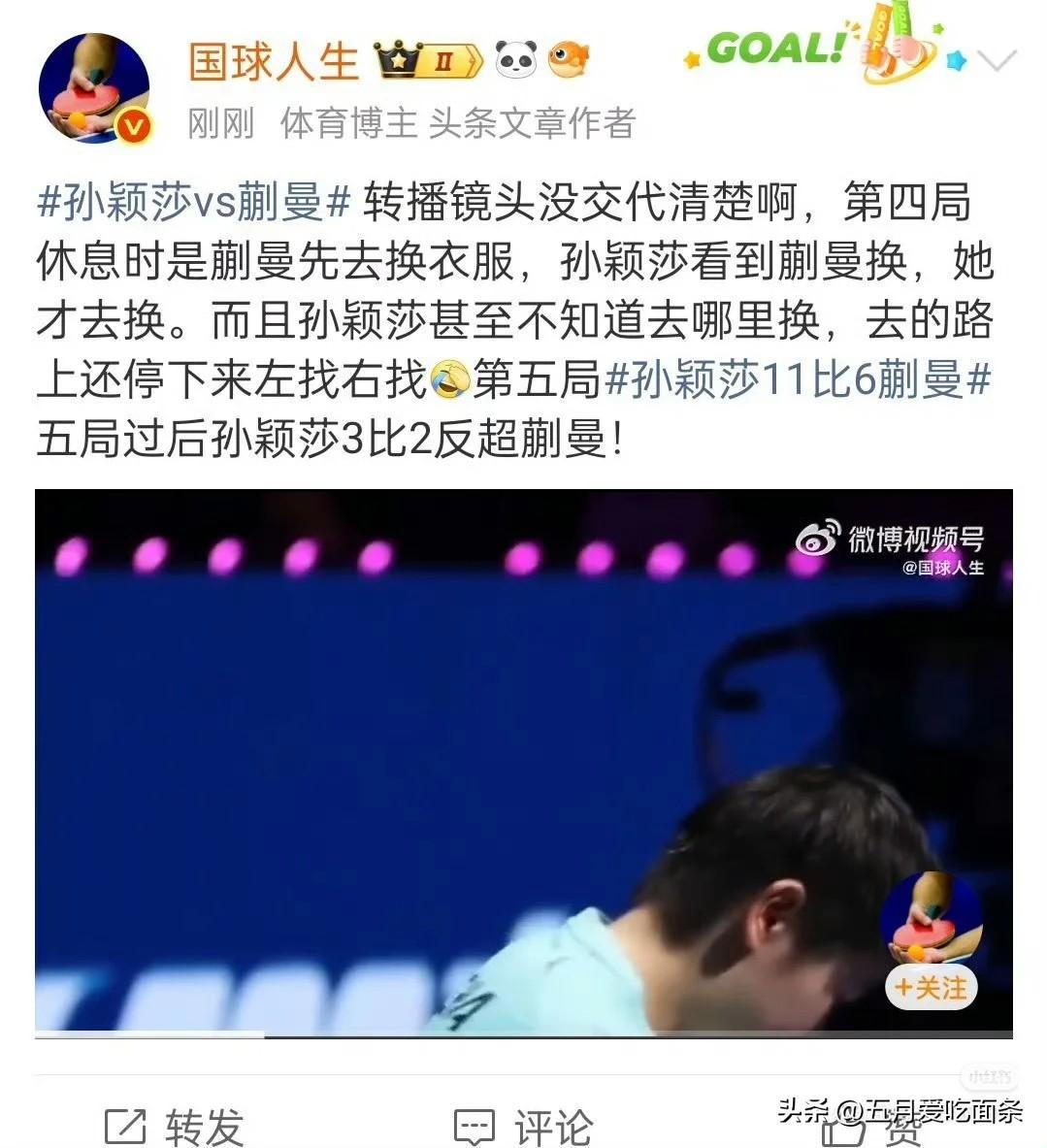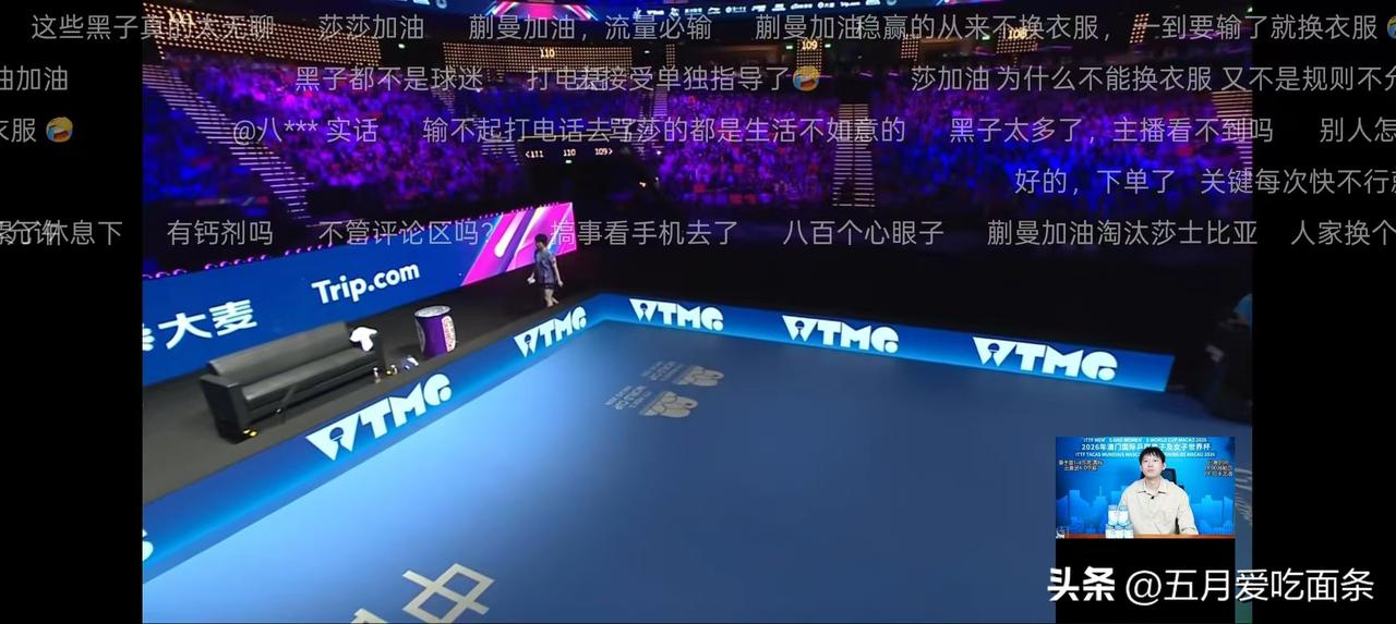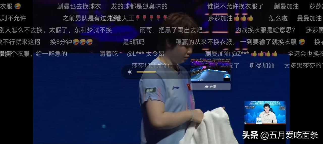 直播画面有显示,蒯曼先去换衣服,莎莎才开始掏衣服换的,并不是莎莎因为落后就想办法拖延比赛。 而在很多直播间,不管是咪咕还是退役球员直播间,大多在骂莎莎。 一身重担,满腹委屈,真相自知,众皆不察。孙颖莎一路走来,从无人喝彩到全球皆知,唯一不变的就是黑子的态度。
