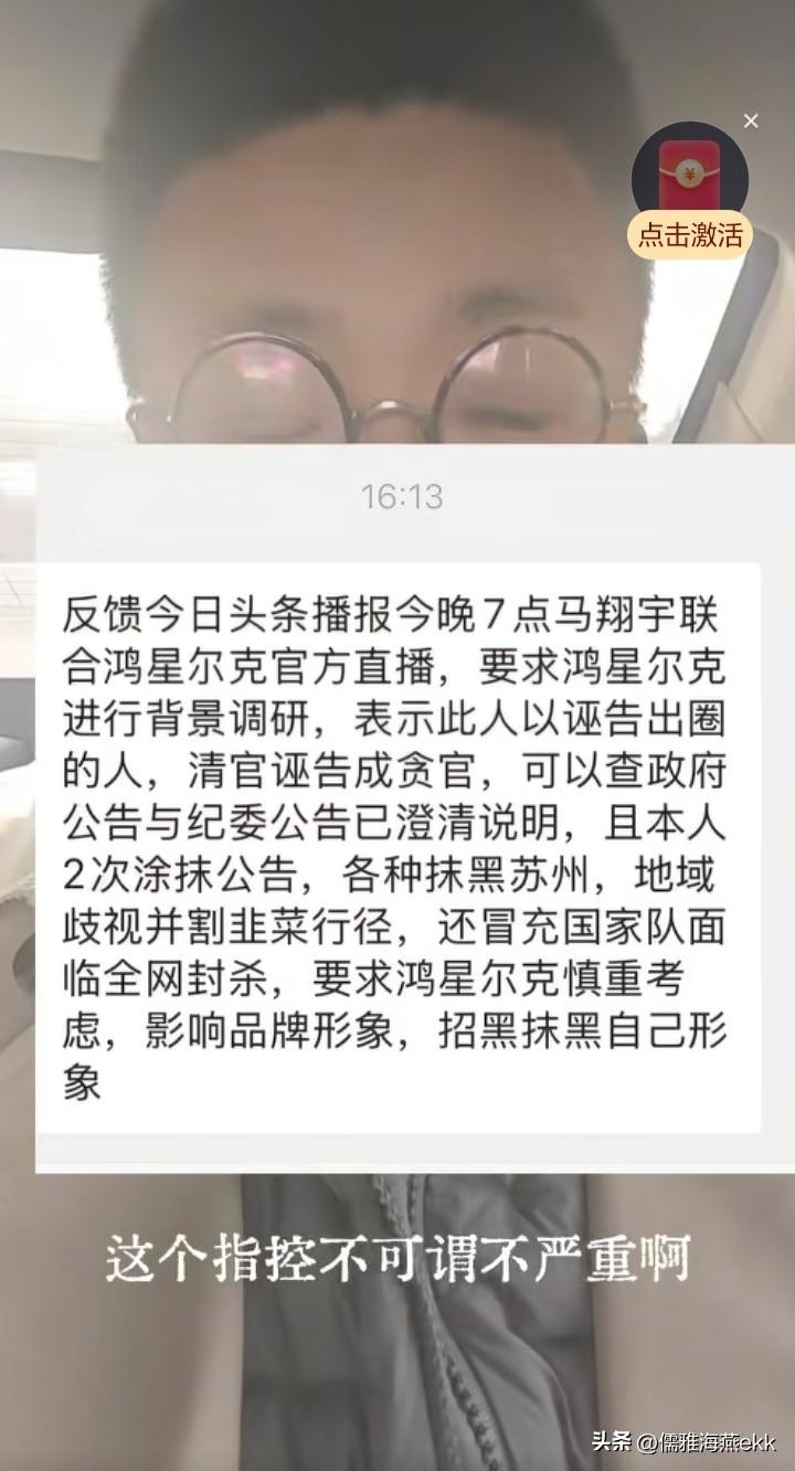 恶意举报+匿名威胁!围堵马翔宇的人真是茅坑的屎——不臭挑起来臭,已经翻篇的事,屡次来搅局,损的是谁,网友心知肚明,一而再,再而三的为难他,可见这些人比黑恶势力更可恶。 公民有权对国家机关及其工作人员行使监督权,马翔宇的实名举报是正义之举,是不是清官,法律已做出了正确的处罚,事情已经该翻篇了,这样纠住不放,围堵马翔宇,是小人之举,可见这帮人平时该多猖狂。 一个地方的声誉,不是能被一个普通市民几句话所左右的,反倒与地方官员的是否作为息息相关。 马翔宇遵纪守法地走自己的路,做一个文化博主,推进宣传地方文旅,直播历史文化,传授知识,可以说碍不着任何人和机构,反倒是正能量满满,他也要生活,恶意打击报复他的人是往自己脸上抹屎,更给地方形象抹黑。 3月27日,马翔宇与鸿星尔克的品牌宣传直播又被人恶意举报不实信息被取消了,这己经是好几次了。 马翔宇对这件事作了补充说明,不怪鸿星尔克,他和鸿星尔克都是受害方。他说,“不掺和,别人都要搞你,那只有背水一战了。” 金证股份创始人徐岷波先生为他的师弟马翔宇呐喊,“别让善良被欺负,别让马翔宇孤军奋战”。 公道自在人心,正义不该被如此打压,大家保持清醒,别被带节奏,支持马翔宇拿起法律武器抵制恶意搅局!支持正能量!