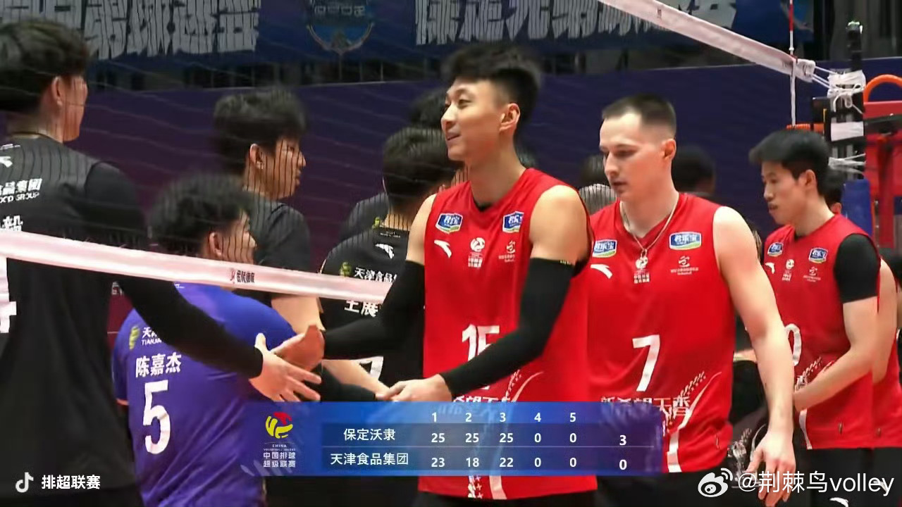 【排超男排】金牌争夺战次回合结束,河北保定沃隶男排主场3-0(25-23 25-18 25-22)零封天津食品男排,将总比分扳成1-1平。