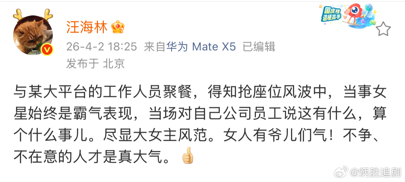 公道自在人心嘛。汪海林疑似夸杨幂大气