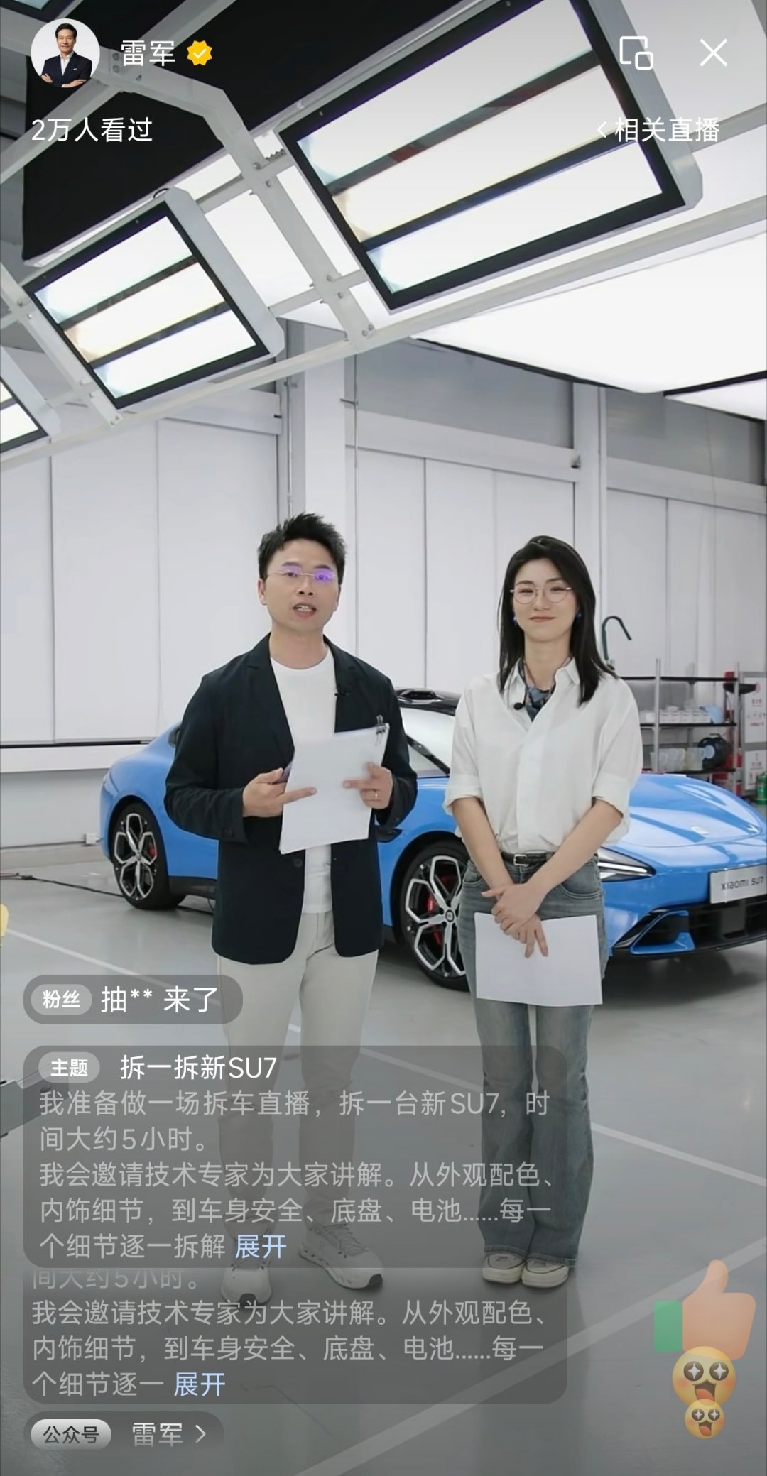 朱教授在讲解碰庄、门把手、气囊时,雷总化身小学生在认真听~说实话,直播拆车真能学