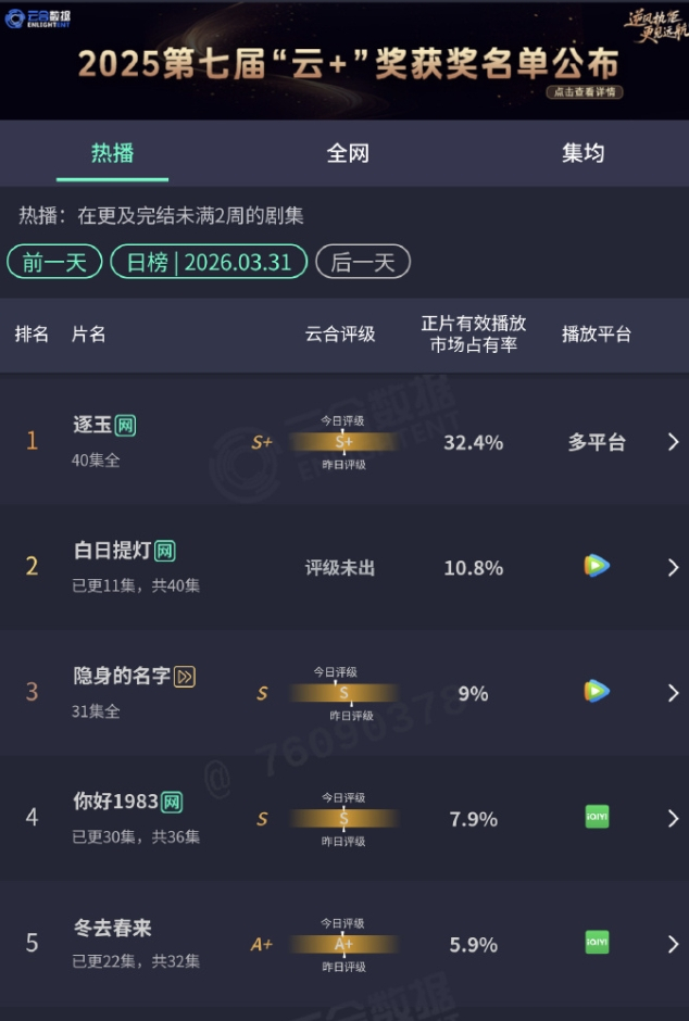 《白日提灯》已经开播四天,云合占比稳定在9%-10%左右,播放量三天连续2200万,腾讯站内热度最高27000,招商最新一集由5广降为2广,再结合这两天的口碑,基本上已经大爆无望,如果保持住现在的数据,和白鹿的《唐宫奇案》水平差不多,最终热播期集均大概在2000万到2500万左右,作为顶流女演员,迪丽热巴应该关注下自己主演作品的招商情况,他至今还没有一部全集有广的电视剧。