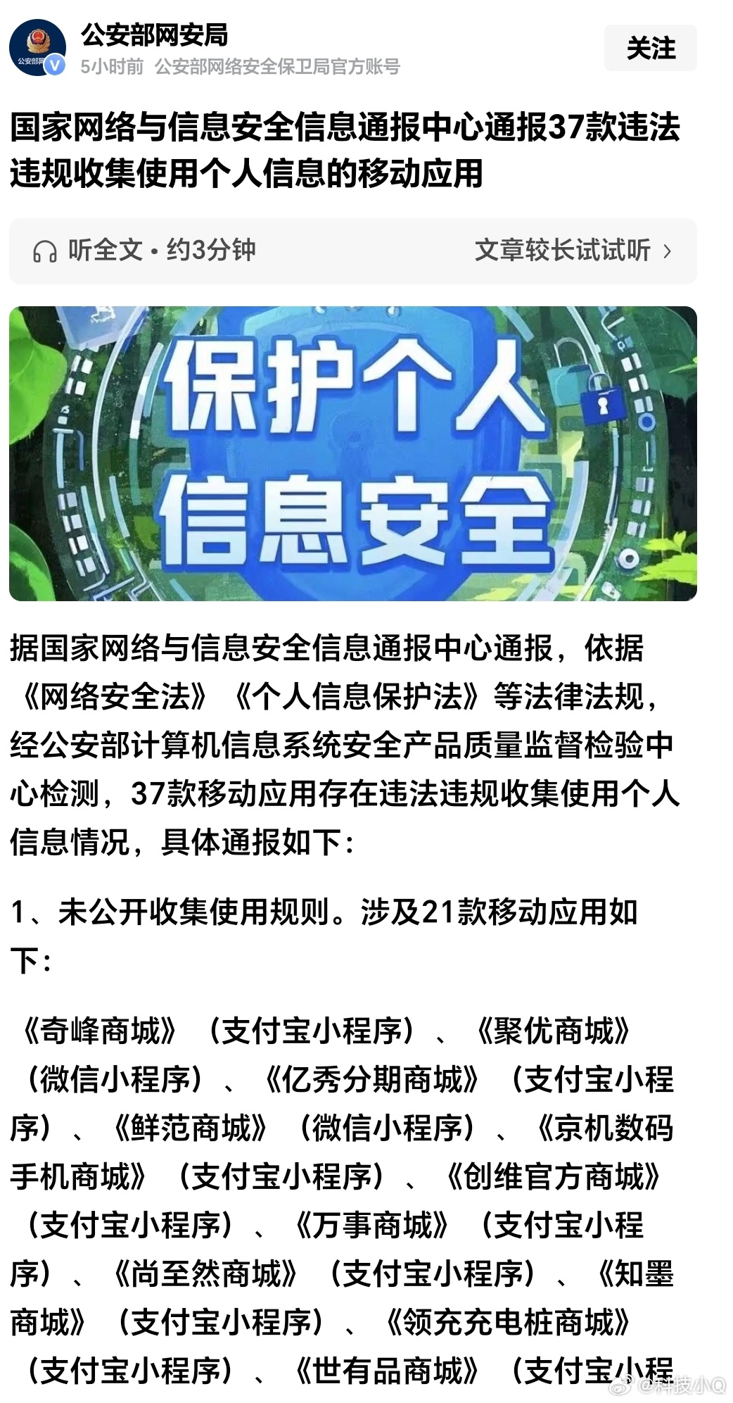 国家网络与信息安全信息通报中心通报,依据《网络安全法》《个人信息保护法》等法律法规,经公安部计算机信息系统安全产品质量监督检验中心检测,37款移动应用存在违法违规收集使用个人信息情况!!!看看你和你的家人有没有中招!!!