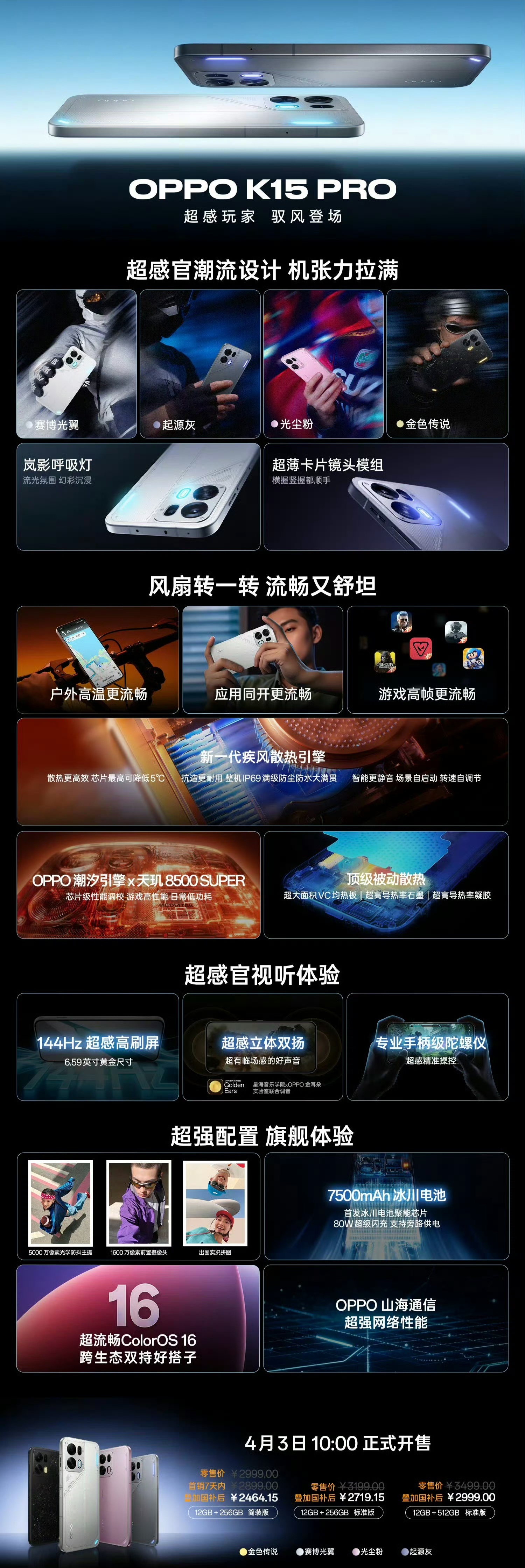OPPO K15 Pro系列这次发布会真的是支棱起来了,两款机型直接把性价比卷到了新高度,完全不像以前的定位。全系标配背光、主动散热风扇还有金属中框,这个价位能给到这种配置,真的太能打了。K15 Pro:走的是小直屏路线,6.59 英寸,拿着比较舒服。主打游戏机配置,天玑 8500S、7500mAh 大电池、80W 充电、双扬、X 轴马达,还带风扇和金属中框,同价位少见。