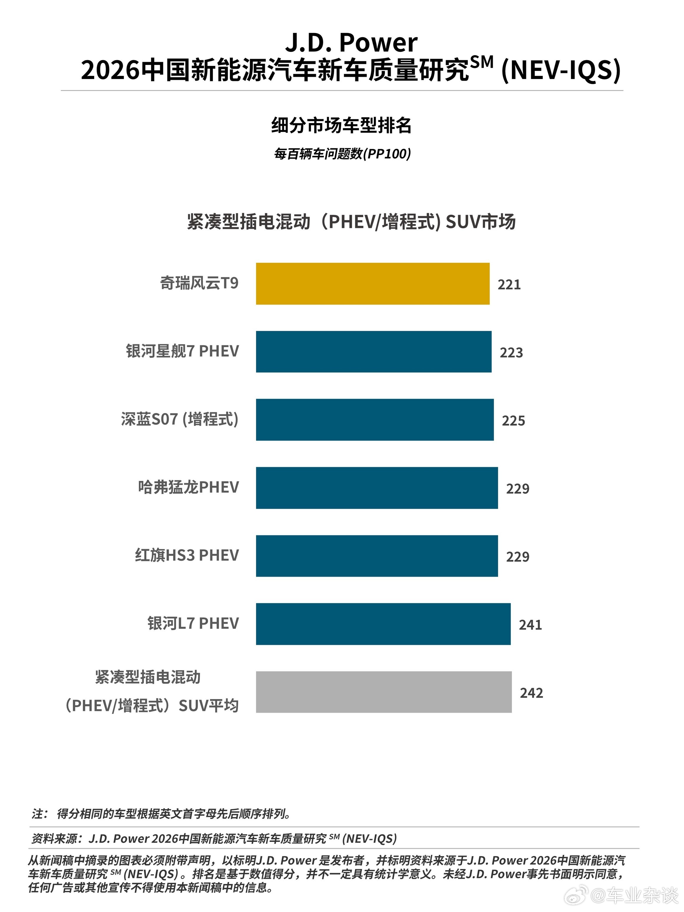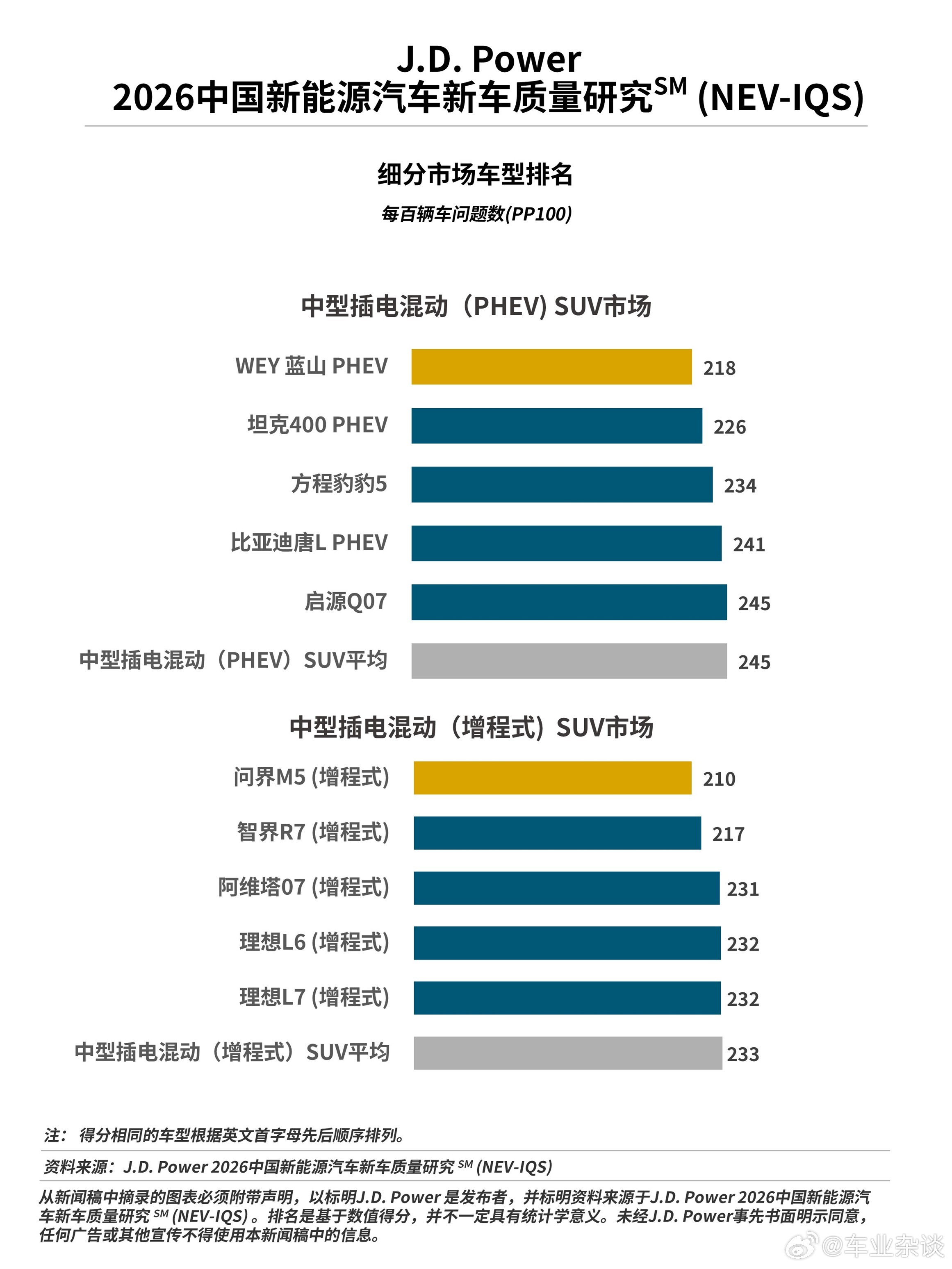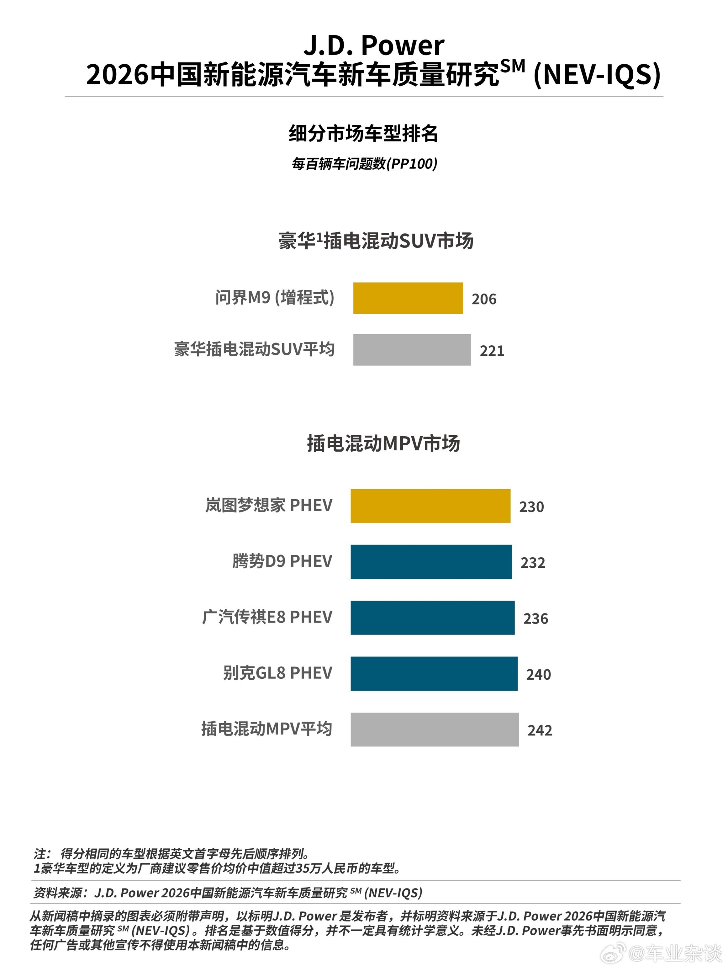 拥车半年,消费者都在抱怨哪些问题?4月2日,J.D.Power发布了2026中国新能源汽车新车质量研究(NEV-IQS),该研究统计和衡量了新能源汽车新车车主在2至6个月的拥车期内遇到的质量问题。两个关键信息和大家分享下:1、质量抱怨从硬件转向软件。电池、充电等硬件相关问题进一步减少,而信息娱乐系统连续三年成为抱怨最高的类别,驾驶辅助抱怨占比也在逐年攀升。其中,驾驶辅助的核心痛点集中在倒车辅助、警报吵闹、功能不准等问题;智舱体验则主要集中在屏幕触控、蓝牙连接等基础交互问题。2、00后渗透率三年翻三倍,预算约束力更弱,但也更挑剔。研究显示, 00 后用户对新能源车的质量投诉 PP100 高达 259,较行业整体水平高出 12%。00后对于动力、空间、补能便利性的关注度显著高于行业,且携宠出行比例远高于行业。所以如何搞定这批挑剔的潜力股,将成为车企们接下来很重要的一个课题。最后再来看看各个细分市场的质量排行,看看你的爱车有没有上榜。大V聊车