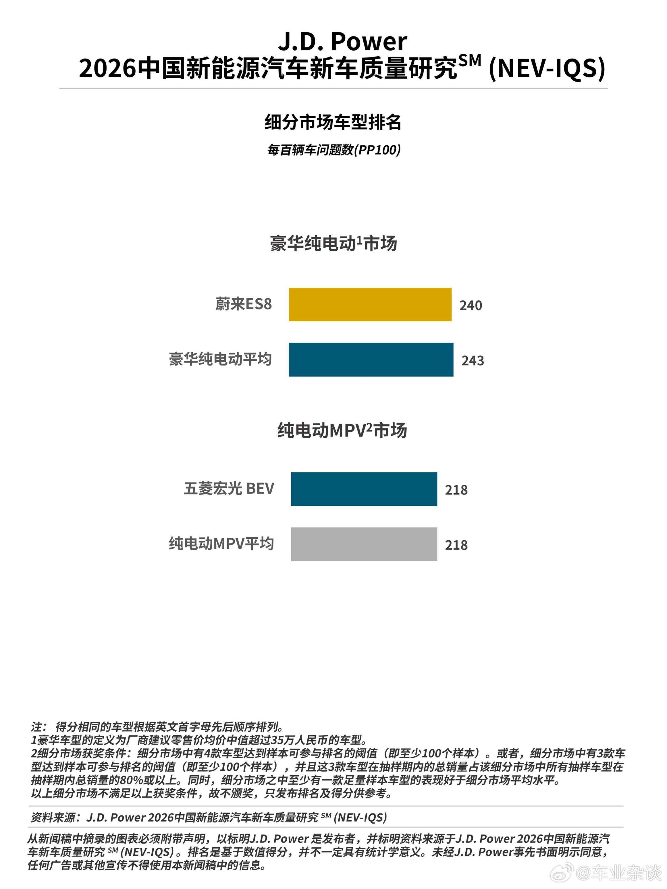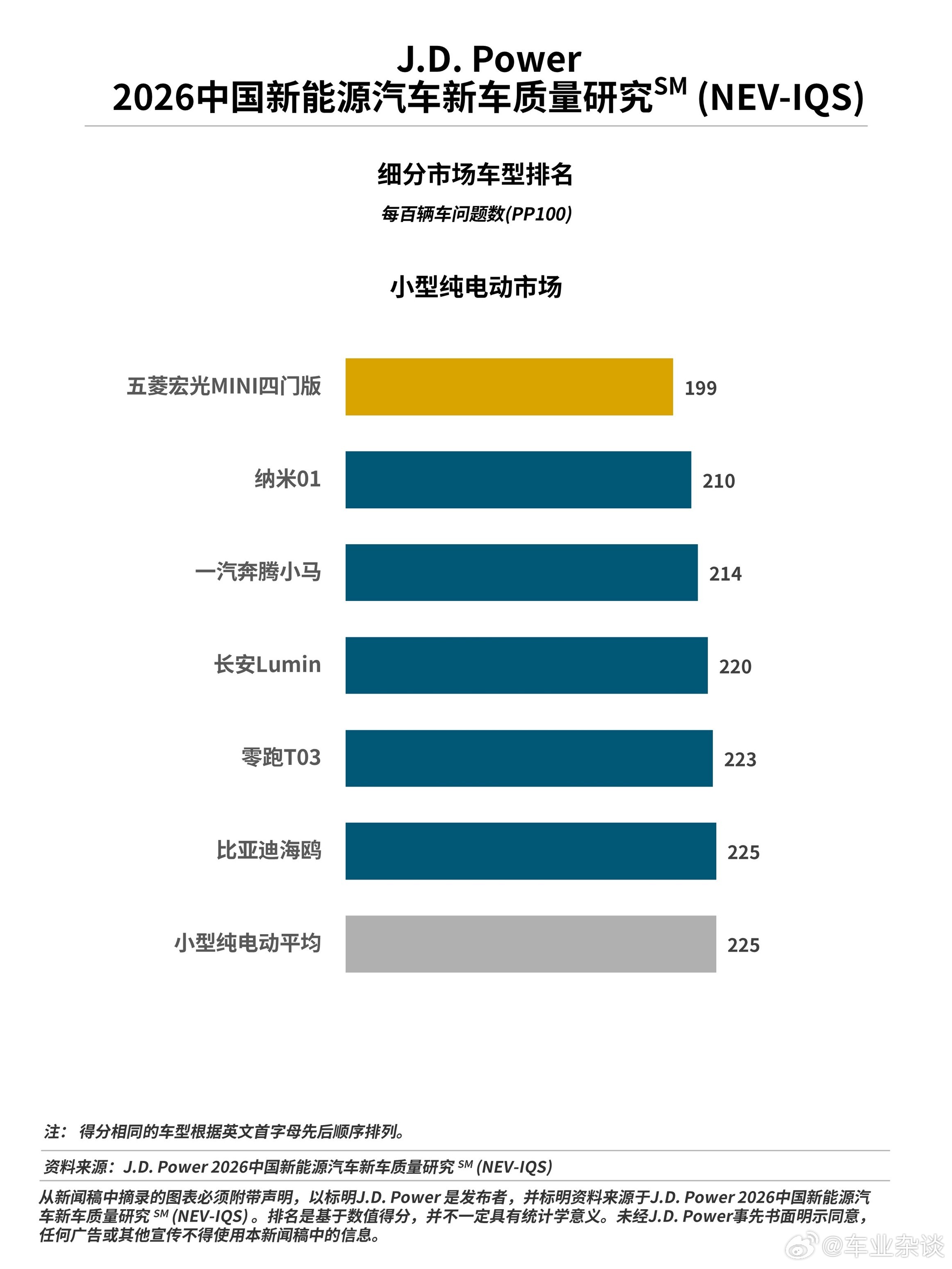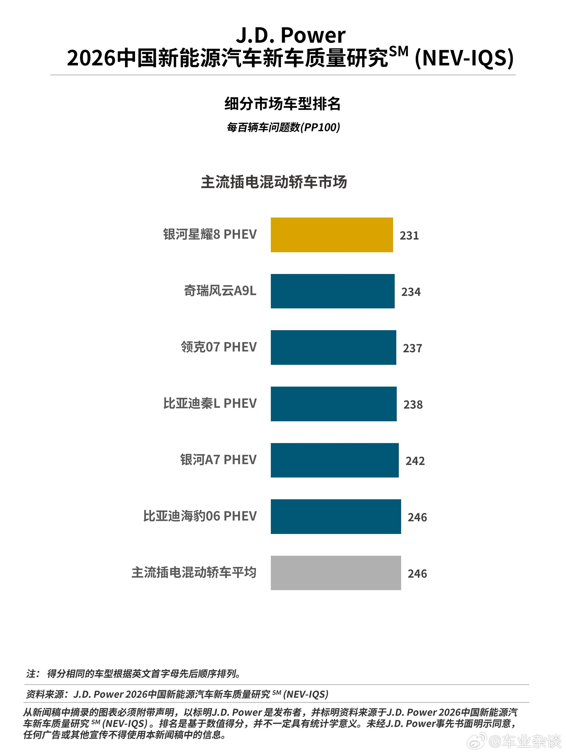 拥车半年,消费者都在抱怨哪些问题?4月2日,J.D.Power发布了2026中国新能源汽车新车质量研究(NEV-IQS),该研究统计和衡量了新能源汽车新车车主在2至6个月的拥车期内遇到的质量问题。两个关键信息和大家分享下:1、质量抱怨从硬件转向软件。电池、充电等硬件相关问题进一步减少,而信息娱乐系统连续三年成为抱怨最高的类别,驾驶辅助抱怨占比也在逐年攀升。其中,驾驶辅助的核心痛点集中在倒车辅助、警报吵闹、功能不准等问题;智舱体验则主要集中在屏幕触控、蓝牙连接等基础交互问题。2、00后渗透率三年翻三倍,预算约束力更弱,但也更挑剔。研究显示, 00 后用户对新能源车的质量投诉 PP100 高达 259,较行业整体水平高出 12%。00后对于动力、空间、补能便利性的关注度显著高于行业,且携宠出行比例远高于行业。所以如何搞定这批挑剔的潜力股,将成为车企们接下来很重要的一个课题。最后再来看看各个细分市场的质量排行,看看你的爱车有没有上榜。大V聊车