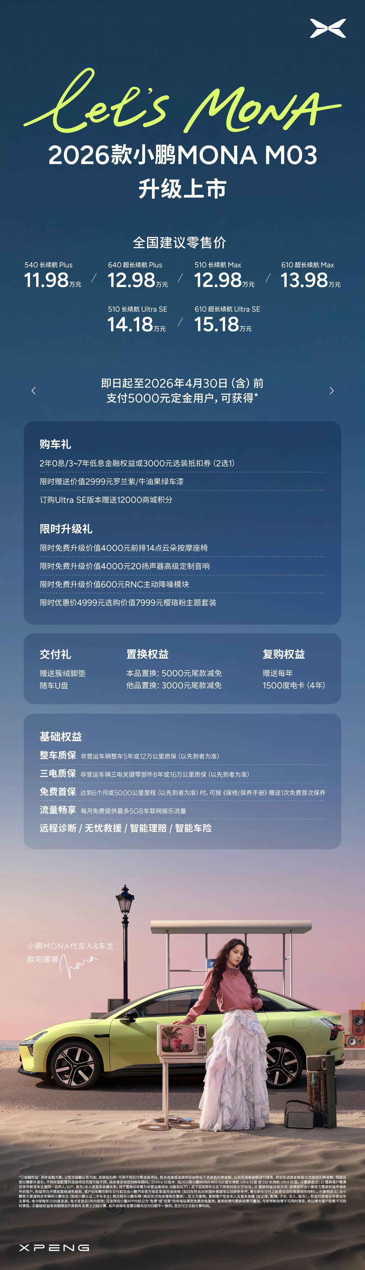 2026款小鹏MONA M03正式上市,售价依旧是11.98万-15.18万元,下面来看下新车有哪些升级和亮点。 1.设计焕新 新增配色:主打低饱和度罗兰紫、牛油果绿,首次推出樱珞粉主题套装(含专属车漆、19英寸轮毂、Nappa真皮座椅); 细节优化:全系标配无边框外后视镜、钢琴烤漆运动包围,尾部升级风刃式保险杠导流槽。 2.智能驾驶升级 Max版搭载自研图灵AI芯片,算力750TOPS,支持车位到车位全场景辅助驾驶(覆盖高速/城市/泊车); Ultra SE版配备双图灵芯片(1500TOPS),直接搭载满血版VLA 2.0。 3.舒适提升 座舱升级:前排14点云朵按摩座椅(含坐垫按摩)、主副驾2.7倍增大化妆镜(三档色温调节)、1.22㎡双层镀银全景天幕; 静谧性优化:前排双层夹胶玻璃+主动降噪。 4.三电与安全 续航最高640km,支持3C超快充(15分钟补能200km); 全系标配爆胎稳行功能,新增冰雪路面紧急避让(AES)功能。 大家觉得这性价比如何?【来自懂车帝车友圈】