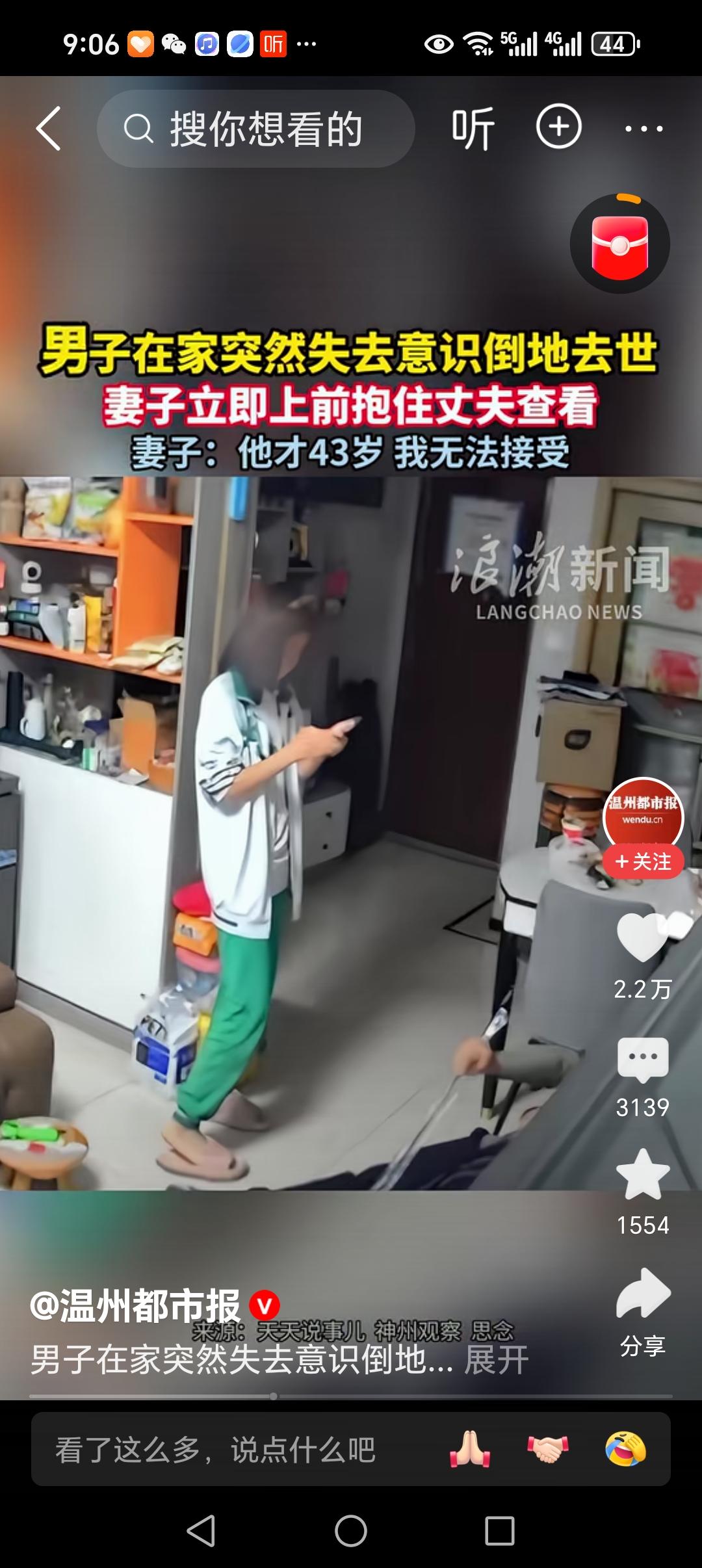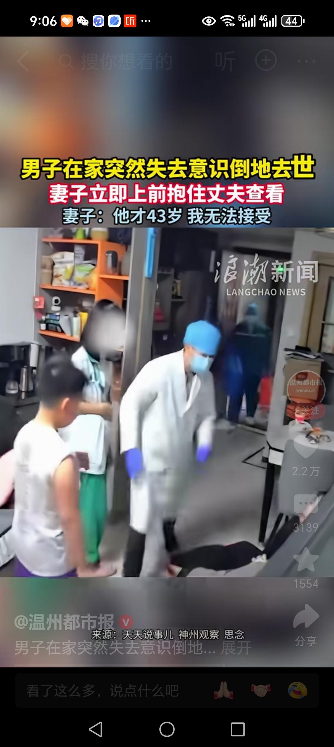 意外来的防不胜防!43岁的男子在家里正和妻子欢声笑语,突然没有预兆的失去意识,妻子发觉不妙,从沙发上一跃而起,抱住了丈夫,丈夫慢慢往后倒下,妻子抱不住他,一起倒在了地板上。 视频我看了好几遍,丈夫倒地的时候,还抽搐着,没有一分钟的功夫,丈夫就不动了。 这个视频,我来来回回看了。 这是幸福的一家人。 一家四口,夫妻俩,一个女儿一个儿子。 晚上10点多的时候,妻子躺在沙发上,腿上盖着一个毯子。 妻子的那一头沙发,坐着他们的大女儿。 儿子正在侍弄自己的衣服,孩子刚刚从洗衣机里面拿出衣服,忙着用衣架撑着。 丈夫坐在妻子旁边,和妻子聊天。 妻子的身边,有一条小狗,妻子一边逗着小狗玩,一边和丈夫快乐的聊天。 如果不是发生了后面的这些意外,他们一家就是平凡普通的一家四口之家。 这个过程中,女儿,儿子,来来回回的。 妻子把手里的逗狗棒给了丈夫。 丈夫拿着那根棍子,站起来,女儿也过来了,三个人在那里聊着天。 视频中,这丈夫突然有些不对劲,他好像就要倒下去。 这个时候,妻子就发现了丈夫的不对劲。 她从沙发上一跃而起,抱住了就要倒地的丈夫。 可是,丈夫太重了,妻子和丈夫慢慢倒在了地板上。 女儿很聪明,赶紧跑到了沙发上,拿起妈妈的手机,拨打了120。 丈夫在地板上抽搐几下,妻子在旁边抱着他。 女儿来来回回打着电话,看着自己爸爸的情况。 儿子好像在洗澡了,从澡堂跑了出来,赶紧穿衣服。 这个过程过去了20分钟,救护人员才到了他们家。 可是,就是这20分钟,这丈夫也没有等到。 救护人员赶到他们家,可是还是没有救回来。 从出事倒地,倒离世,也就是几分钟,快的让家人来不及反应。 看了这个视频,让人心里很沉重。 43岁的年纪,正是上有老下有小的时候。 他却突然去世,留下妻子和孩子,还有白发苍苍的父母。 让人心里不免伤心和叹息。 中年人的累,中年人的苦,都不言而喻。 熬夜,吃外卖,成了很多疾病的温床。 所以,中年的我们,如果身体感到不适,就需要去医院看看,不要拖拉磨蹭。 视频中,男子几分钟就去世了,很多可能是心梗或者脑梗。 前几天,前面的邻居,也是因为心梗去世了。 他下了夜班回家,妻子还没有起床,他就站在床边和妻子说话,说着说着就倒下了。 妻子打了120,医生到了时候,人早就没有了呼吸。 [祈祷][祈祷][祈祷][祈祷][祈祷][祈祷] 逝者已逝,生者坚强!丈夫猝死 丈夫昏迷 夫妻事故