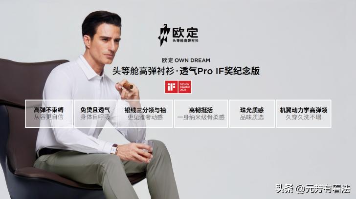 中国品牌越来越牛了,2026年iF设计奖的名单最新公布名单。 茅台、追觅都在榜上。蔚来靠换电技术拿了奖,群核科技刚通过聆讯,成了“杭州六小龙”里第一家走完IPO流程的企业。追觅的黑石三筒洗衣机也拿了奖,三区分洗解决了衣服交叉污染的麻烦。 这些品牌的共同点,是靠技术赢的,但名单里有一类产品,让不少人愣了一下,商务衬衫。而且还是中国品牌——欧定头等舱高弹衬衫。 iF设计奖被称为“设计界奥斯卡”。它怎么评?五个维度:外观、功能、理念、差异化、影响力。一件衬衫能拿这个奖,放在几年前不太可能。 3月28日的发布会上,欧定公布了这件衬衫的获奖密码。先说透气。传统衬衫夏天穿半天,后背就黏在皮肤上。欧定用了Pima棉和超韧天丝混纺,加上一种叫“斡旋U型互锁”的织法。面料内部形成双气道结构,空气从一条气道进入,汗液从另一条气道排出。这叫虹吸效应。结果就是速导湿、快散热。透气率超过180mm/s,达到专业运动服饰的水平。再说弹力。透气Pro延续了8倍高弹技术。面料随身体自然伸展,抬手下蹲时肩膀和后背不会被扯住。 不仅如此,还有新的版型技术,FromX智塑三显版型,通过调整肩线、腰线和下摆的比例,在视觉上拉长腿部线条,这个版型配合AI定制,让做出来的衬衫更合身得体,视觉上显高显胸肌显腿长。 从新能源汽车,到家电到身上的衬衫,中国品牌开始用技术解决具体的问题。