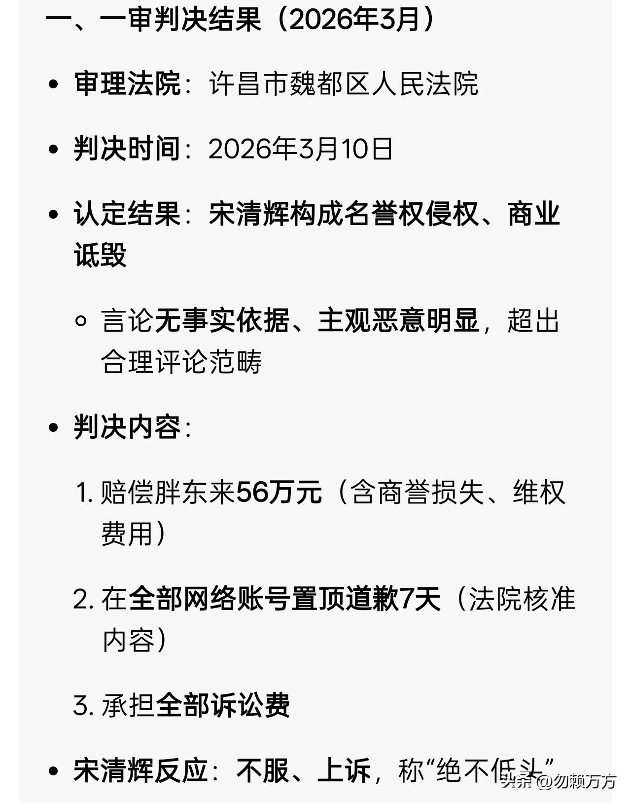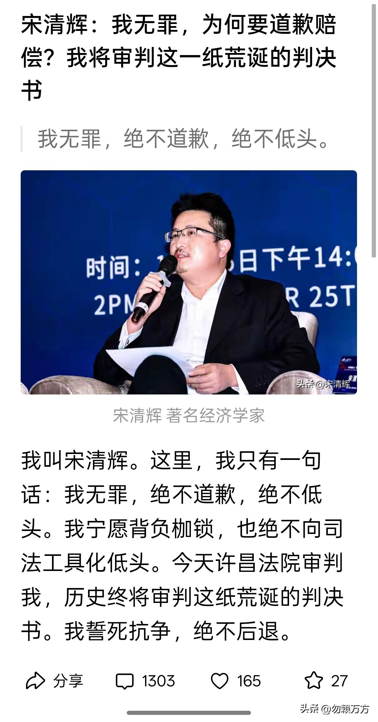 针对胖东来诉宋清辉名誉侵权案的一审判决,宋清辉表示不服、上诉,绝不低头。 这当然是他的法定权利,甚至他这种不认输的劲儿还让我有点儿佩服。但是看他在网上发布的内容,又感觉到他真有点儿颠三倒四,信口开河。比如他说“我无罪,为什么要道歉赔偿?”某人有罪无罪只有法庭才能确定,何况法庭也没说你有罪,只是判你侵权,“道歉赔偿”是你对法律的尊重,与“罪”无关。又比如他说要“警惕于东来操弄地方权力”,这是很严重的指控了,但是也没见他提供什么有力的证据。即便真有其事,那主要责任也是在“地方权力”吧?为什么把矛头指向于东来呢?“历史终将审判判决书”更是把自己的判断放在了法律之上,自信满满,但是依据何在呢?