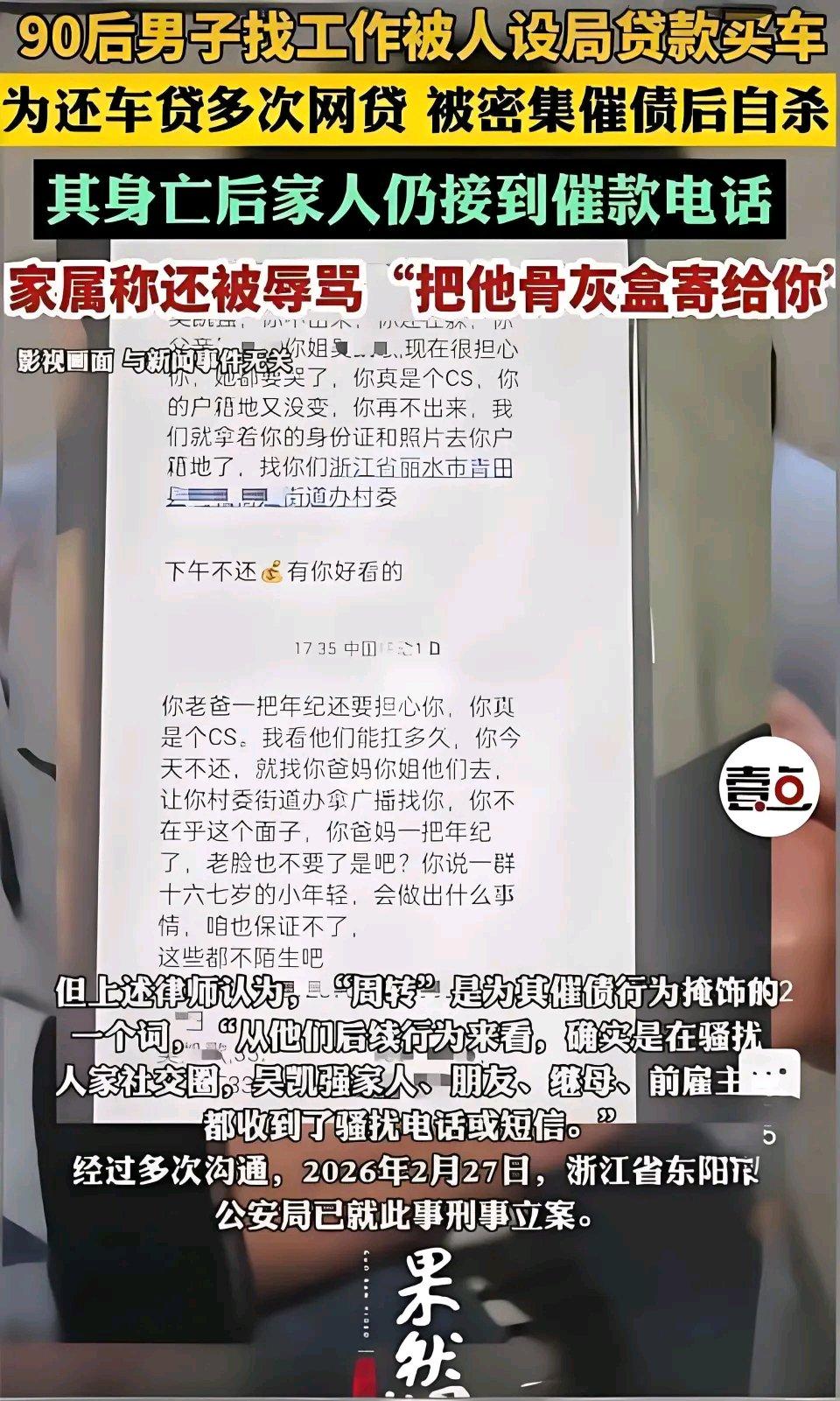 套路贷有多狠!浙江33岁男子被逼在母亲坟前自杀,催收电话追到死后还在打这起令人痛心的事件,揭开了套路贷那丑恶而又残忍的真面目。 在这个快速发展的时代,套路贷就像隐藏在暗处的毒瘤,不断侵蚀着人们的生活。这位33岁的男子,或许是因为生活中的一些压力,一时不慎陷入了套路贷的陷阱。那些不法分子,打着借贷的幌子,用看似诱人的条件吸引着急需资金的人,却在背后布下了层层陷阱。 从借款开始,高额的利息就像滚雪球一样越滚越大,男子在巨大的还款压力下苦苦挣扎。他可能努力工作,想尽各种办法去偿还这笔债务,但面对利滚利的数字,一切都显得那么无力。 催收人员更是残忍至极,他们根本不顾及借款人的实际情况和感受。在男子被逼得走投无路,甚至在母亲坟前结束自己生命后,那些催收电话依旧无情地打来。这不仅仅是对生者的折磨,更是对逝者的不尊重,对一个家庭的二次伤害。 我们不禁要问,套路贷为何如此猖獗?监管部门又该如何加强监管力度,遏制这类违法犯罪行为?这需要全社会的共同关注和努力。相关部门应加大对套路贷的打击力度,完善法律法规,提高违法成本,让这些不法分子不敢再肆意妄为。 同时,我们每个人也应该提高警惕,增强防范意识,远离套路贷。在面对资金需求时,要选择正规的金融机构进行借贷,避免陷入类似的悲剧。希望这样的事件不再发生,让每个家庭都能远离套路贷的阴霾,重新找回安稳和幸福。