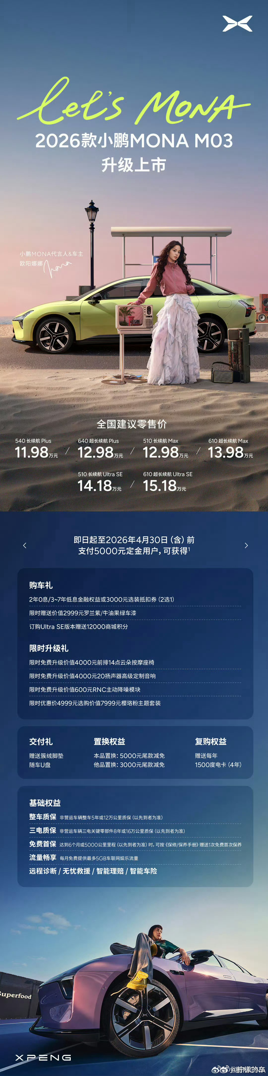 时隔583天的全面升级,小鹏MONA M03没有辜负大家的期待,终于在今天迎来了2026年改款,这次的MONA是在小鹏进击第二代VLA后的第一次改款,从里到外都有质一样的升级2026款小鹏MONA今日上市2026 款小鹏MONA大大大大大升级