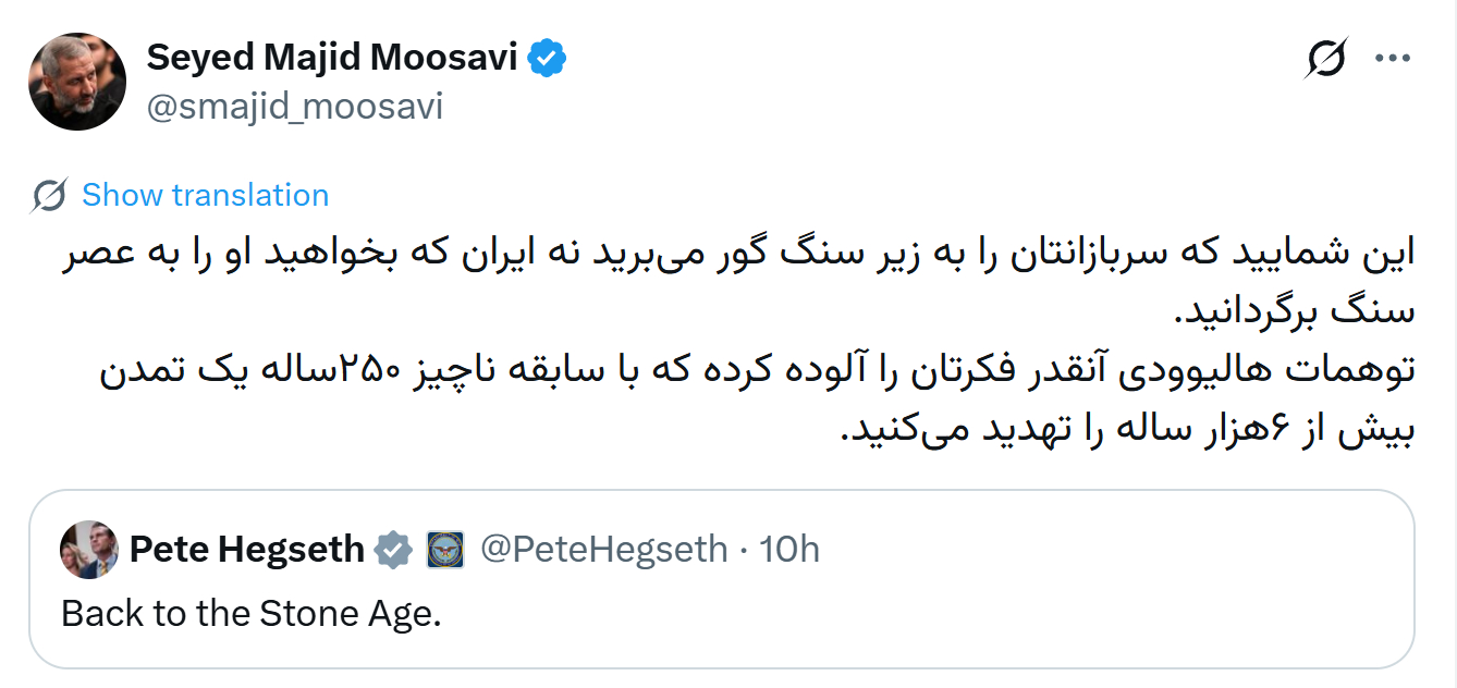 #伊军称250年美国竟敢威胁6000年伊朗# 【伊朗军方回击美方“石器时代”言论:你们脑子被严重污染,250年历史竟敢威胁6000年文明】当地时间4月2日,针对美国国防部长赫格塞思所谓“让伊朗回到石器时代”言论,伊朗伊斯兰革命卫队航空航天部队司令马吉德·穆萨维发文予以回击。