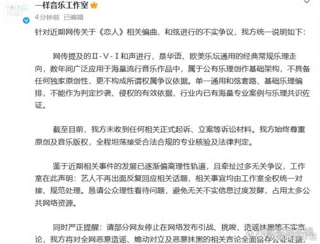李荣浩方否认恋人抄袭2日,李荣浩方工作室回应《恋人》编曲争议,网传提及的Ⅱ-Ⅴ-Ⅰ和声进行,是华语、欧美乐坛通用的经典常规乐理走向,属于公有乐理创作基础架构,不具备任何独家原创性,更不构成所谓权属争议依据。