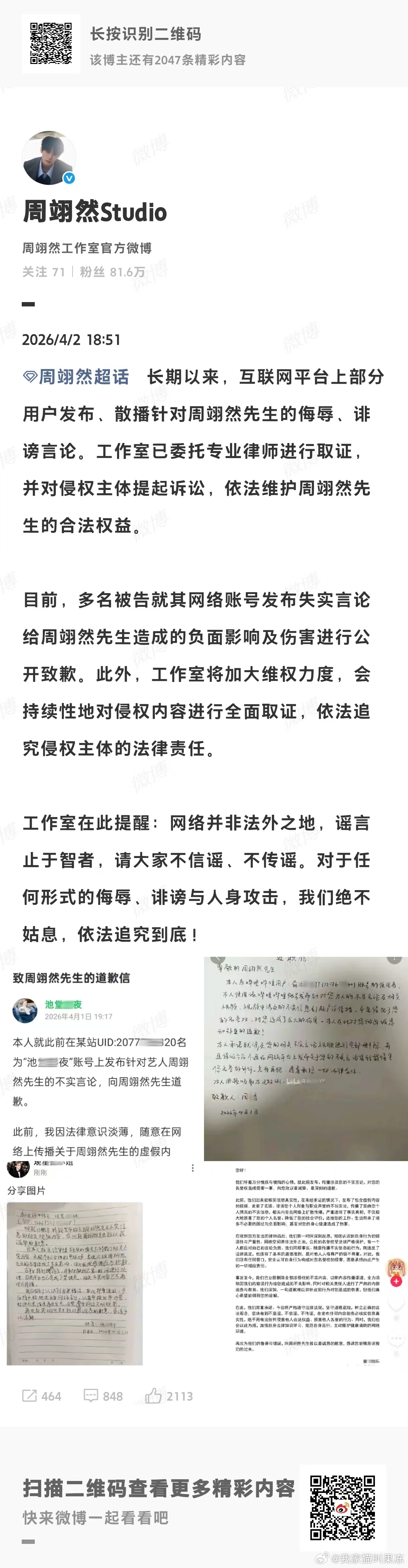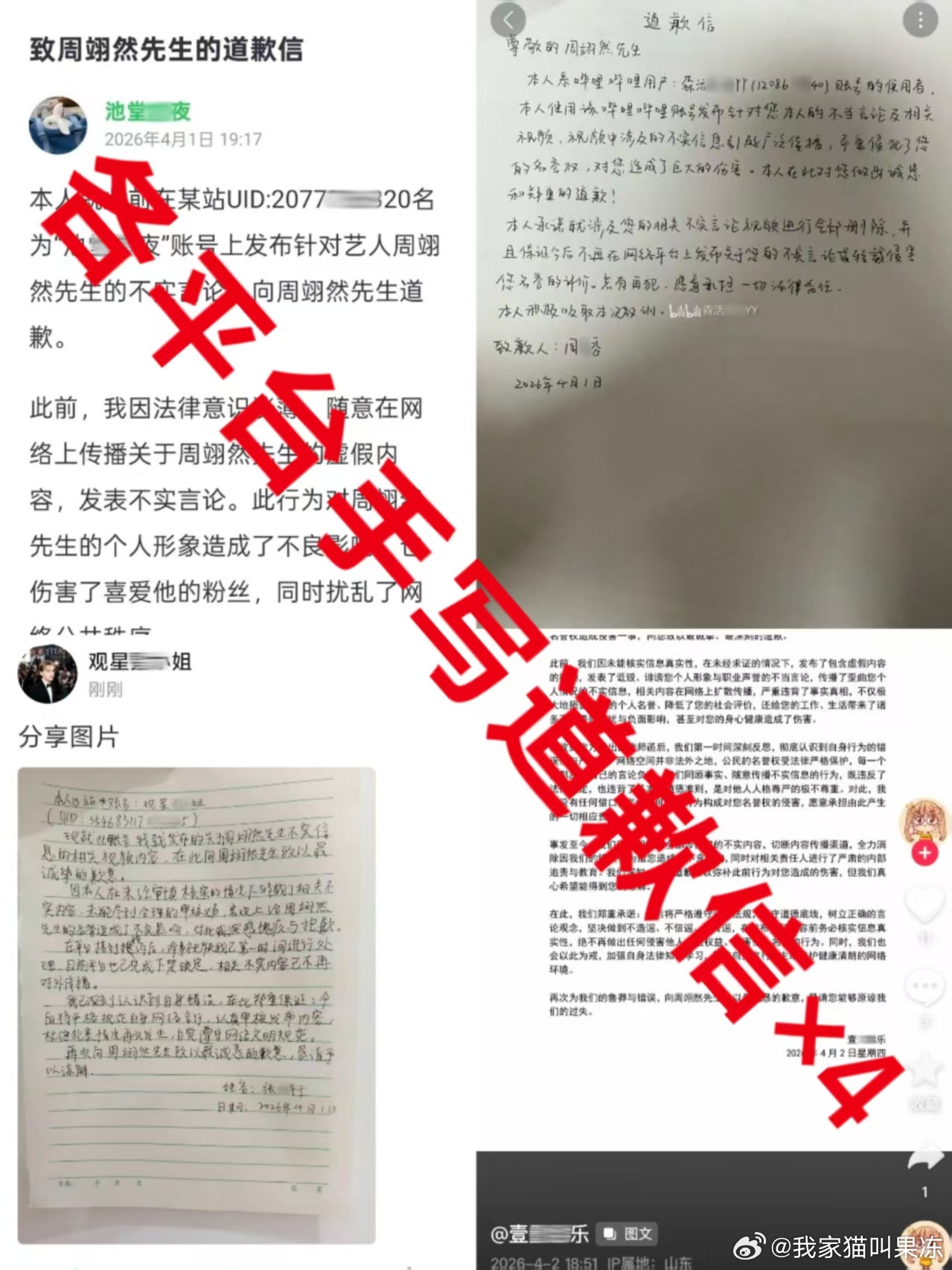 周翊然工作室公布告黑进度,各平台手写道歉信有