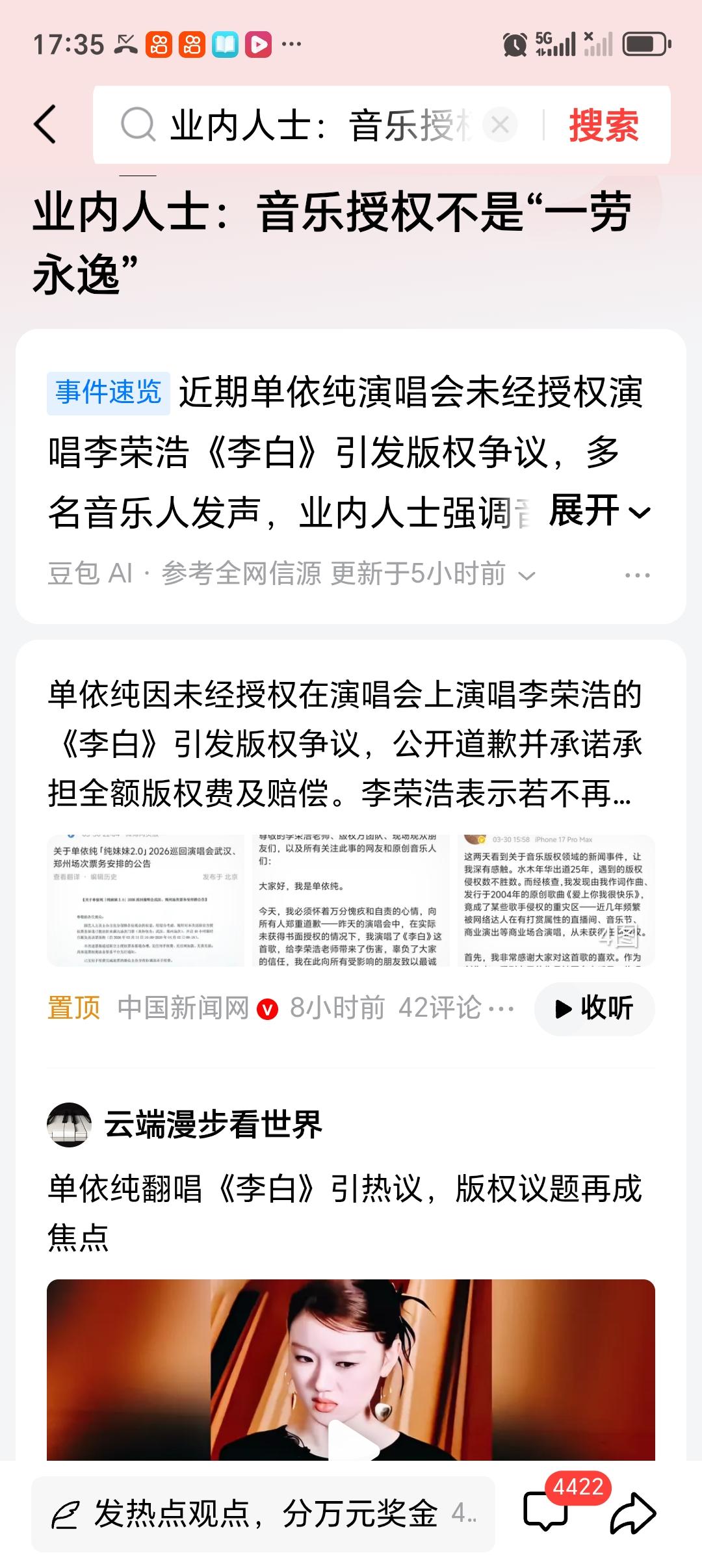 业内人士:音乐授权不是“一劳永逸” 最近音乐版权问题闹得沸沸扬扬。单依纯巡演未经授权演唱李荣浩《李白》,引发全网对音乐版权保护的关注。主办方开启限时免责退票,单依纯致歉并承担费用。可律师都说了,歌手不能以“不知情”免责。 其实不止单依纯这事儿,华晨宇工作室回应《我的滑板鞋》版权争议,水木年华成员卢庚戌追讨版权费,都让“音乐版权”成了焦点。业内人士说得没错,音乐授权不是“一劳永逸”,必须“先授权、后使用”,还得“一事一议”。这也给音乐圈提了个醒,尊重版权,别心存侥幸。