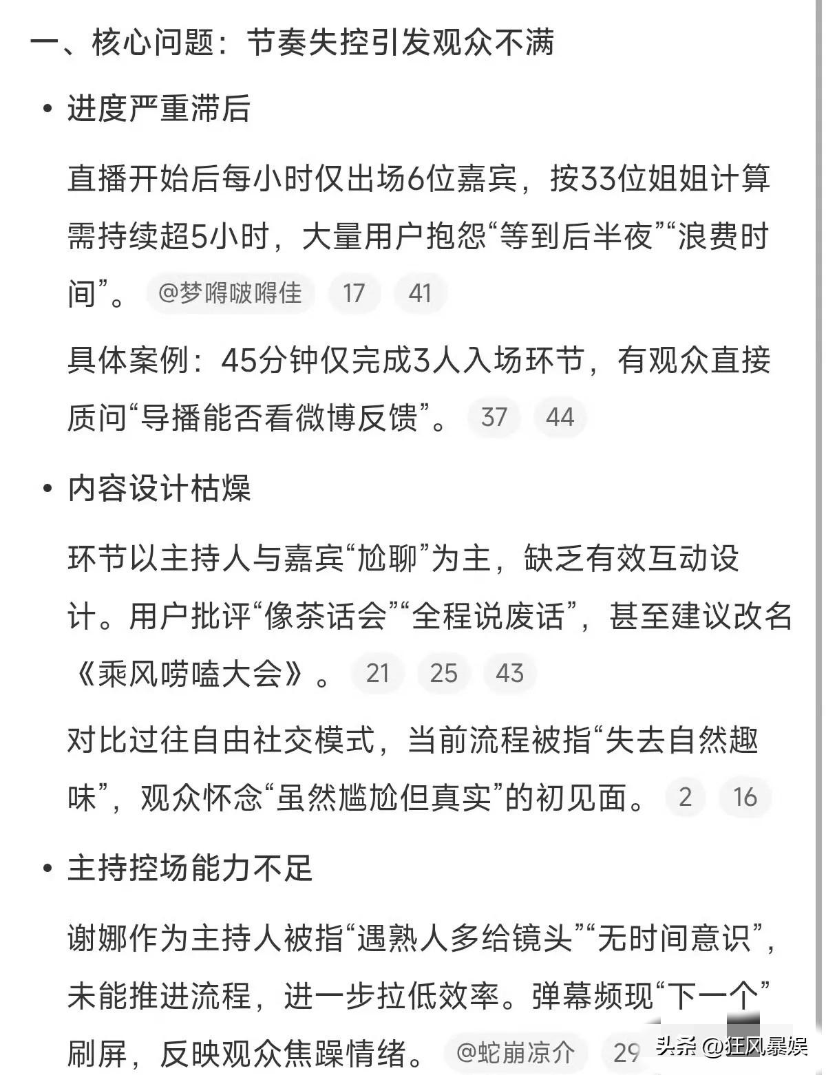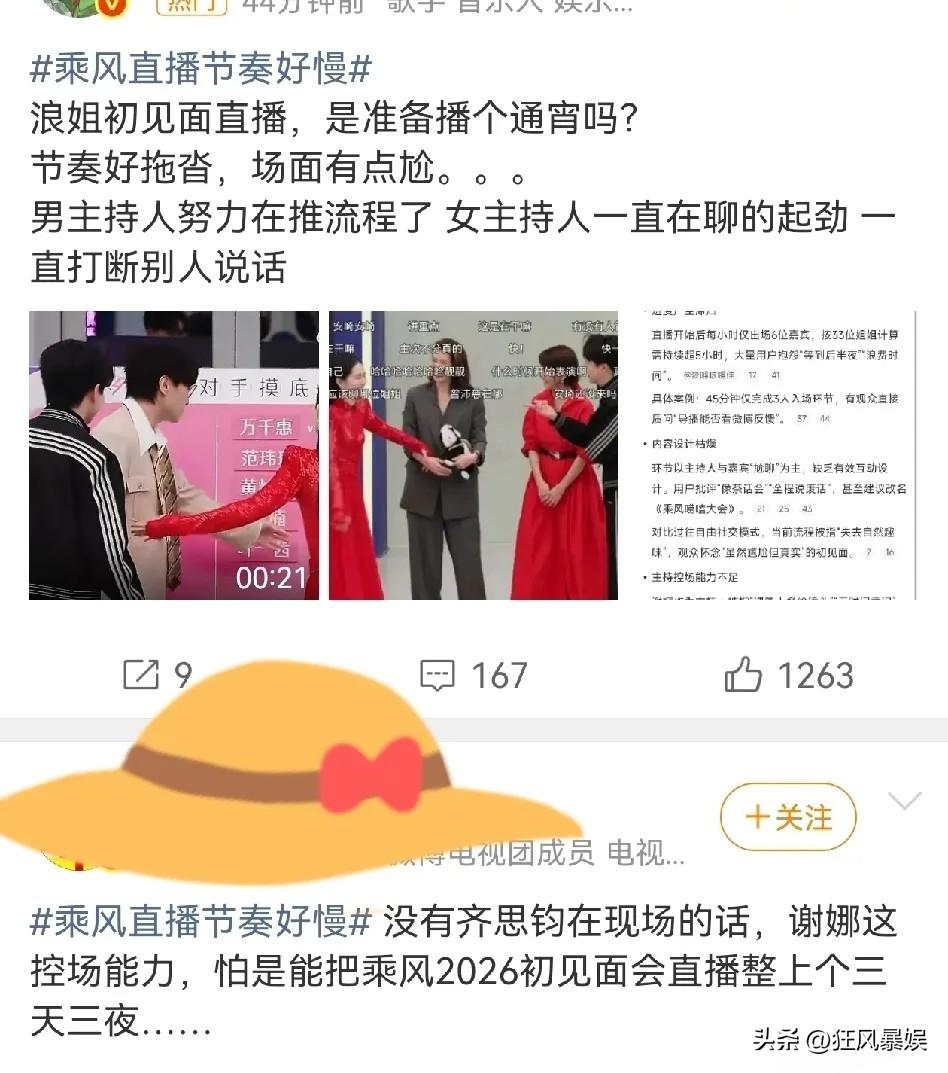 谢娜,不行换个赛道吧! 《乘风破浪的姐姐》刚播,但主持人阵容却引发了不小的争议。 目前,节目依旧沿用齐思钧与谢娜的组合。谢娜作为“乘风发布人”,延续了她一贯的活泼风格,齐思钧则承担串场和报幕工作,两人分工明确。 然而,豆瓣等社交平台上,关于主持人的讨论并不平静。有观众直言“谢娜主持得好无聊,完全撑不起来”,认为他在姐姐们的热闹场面中显得有些“工具人”,缺乏存在感。 还有不少网友提出建议:不如让吴昕、沈梦辰这些“自己人”来主持。她们本身就是姐姐,既能唱跳又能控场,对节目流程也熟悉,或许比专业主持人更有化学反应。 回顾节目历史,主持人确实一直在变——黄晓明、秦昊都曾担任过“成团见证人”。换主持人并非没有先例,但正在播出的这一季,阵容基本已经固定。 观众呼声再高,也只能等下一季了。