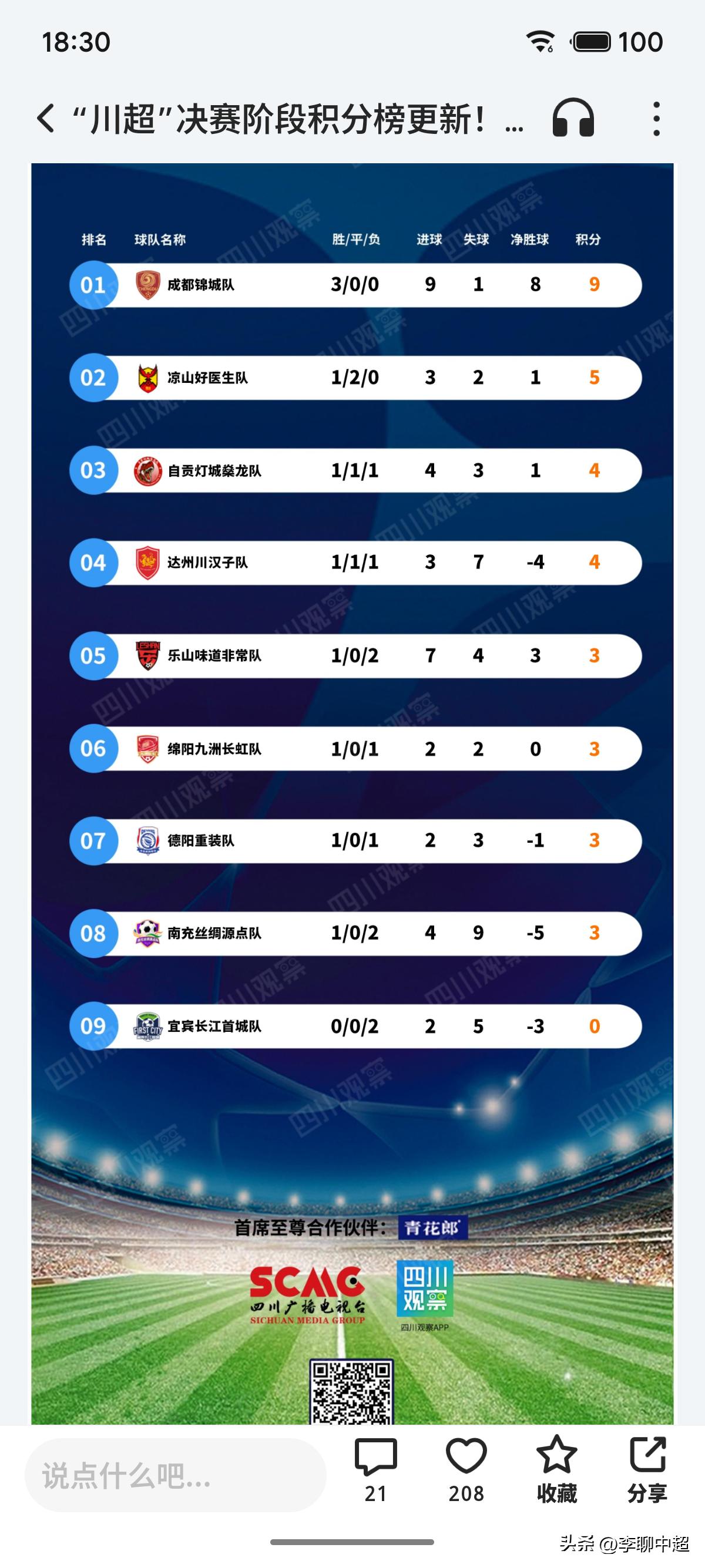 本周六,川超联赛第二阶段第四轮继续上演激情对决! 周六晚19:35分!上轮输球的绵阳九州长虹队将在主场南河体育中心迎接南充丝绸源点队的挑战!本场绵阳九州长虹队势在必得,目前三轮过后(绵阳九州长虹实际踢了两场)仅积三分,排在川超联赛积分榜的第六位!这对于志在冲击前三的绵阳九州长虹队来说,实在低于预期!绵阳九州长虹队是一支明显的攻弱守:强的球队!球队的攻击力是九强中最差的球队,没有之一!上一轮与达州川汉子一战中,主力前锋欧绩因伤下场!本场能否上场成疑!谁能扛起绵阳九州长虹队的进攻大旗!? 对手南充丝绸源点队上一轮以3:2战胜乐山味道非常队,球队在结束两连败后战胜强敌士气高涨!本轮面对攻击力不强的绵阳九州长虹!他们的目标肯定不会是一分!只要客场战胜绵阳九州长虹队!在积分榜上就将再次提升! 南充丝绸源点队最大的特点是进球不少,但失球更多!他们在前三轮进四球,失了九球!后防问题不少!面对主场作战的绵阳九州长虹队,他们的防线能扛的住吗? 本人大胆预测本场结果,鉴于绵阳九州长虹与南充源点队的实力!本场绵阳九州长虹将以1:0或2:1战胜南充丝绸源点!不知道大家的预测结果是什么?欢迎大家参与讨论!