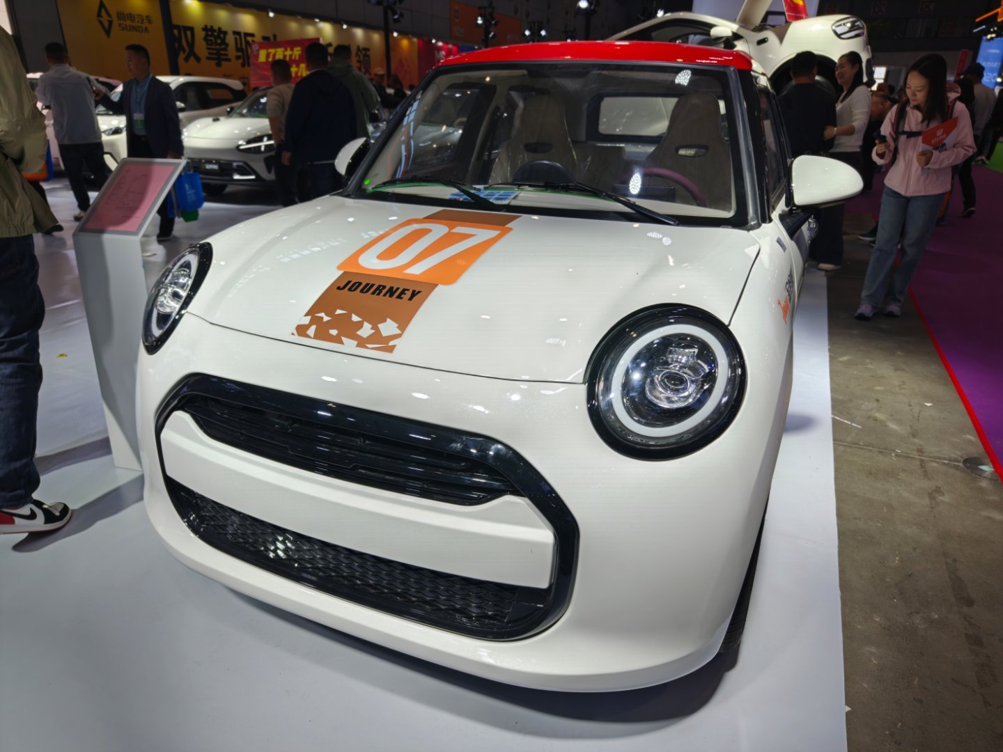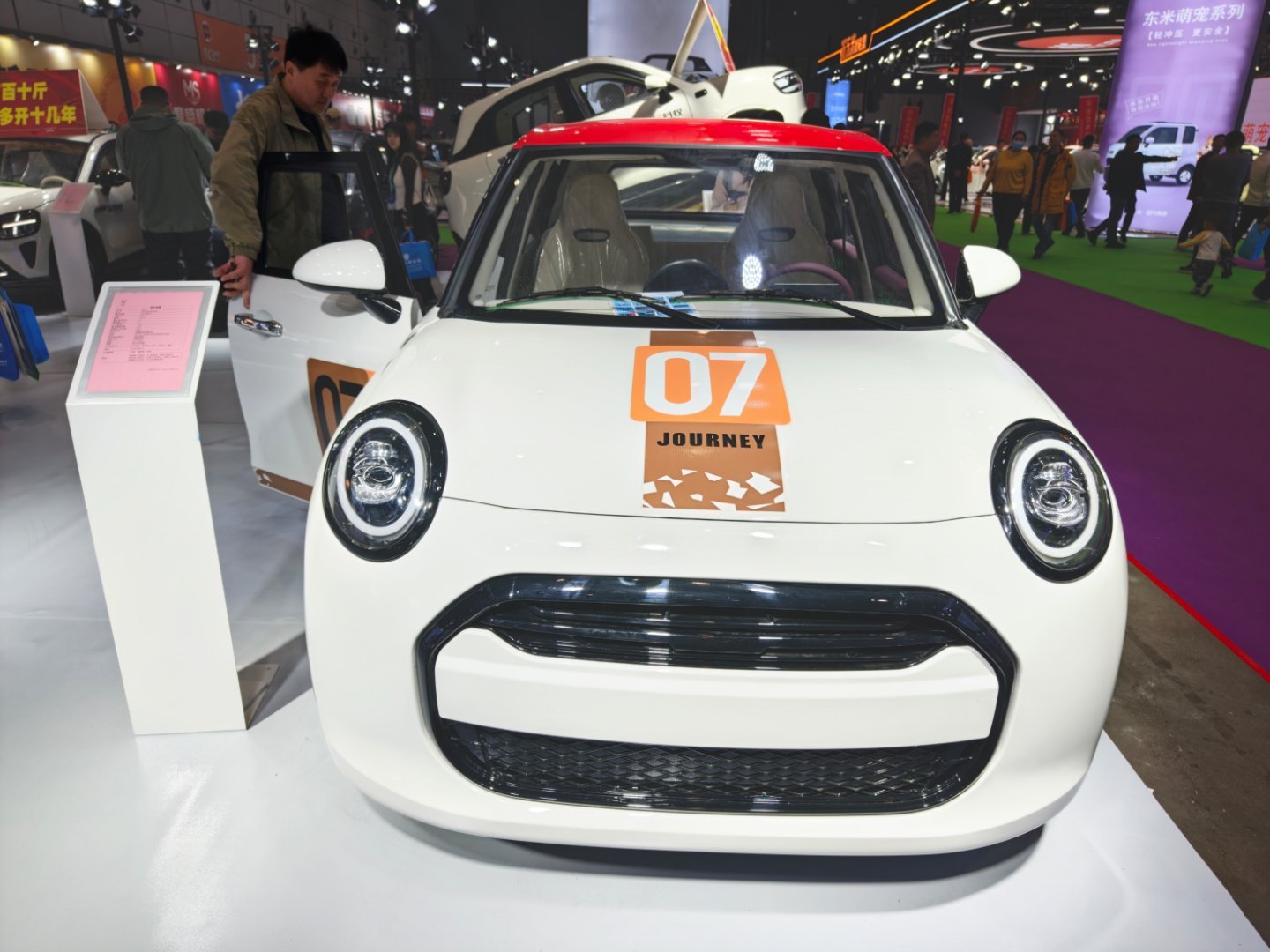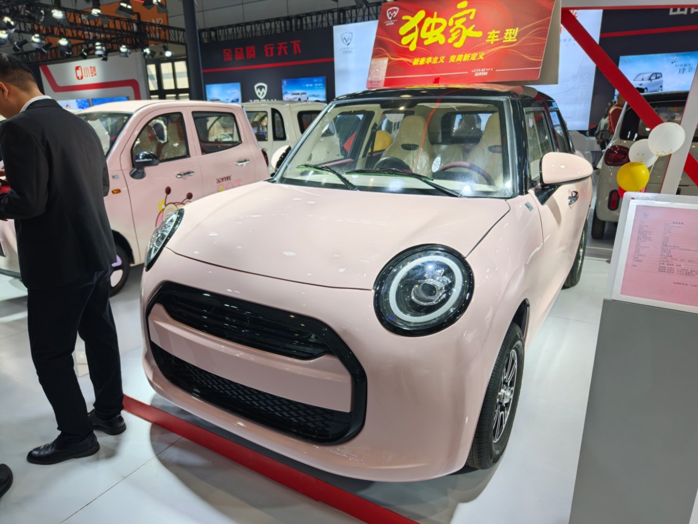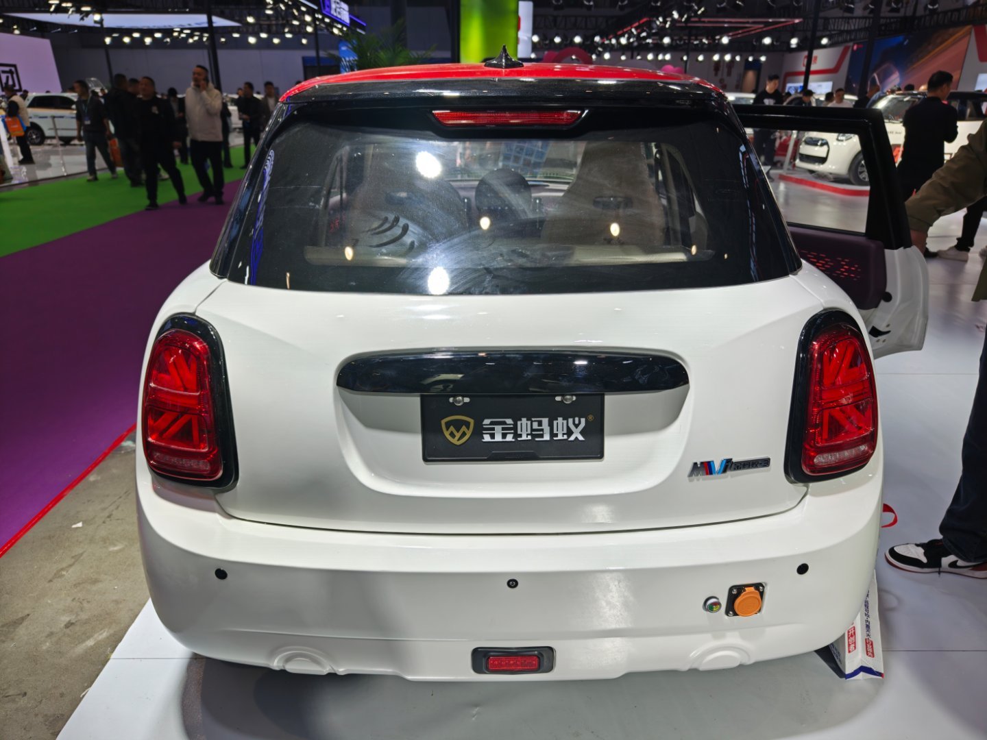 这个山寨的MINI纯电,写的是独家车型,一个是外形真的太像了,再次征服了我,开到路上你真的不一定能分清楚。第二个是内饰都复刻了,圆形的中控屏、出风口还有副驾驶的氛围灯设计,一个字:绝!