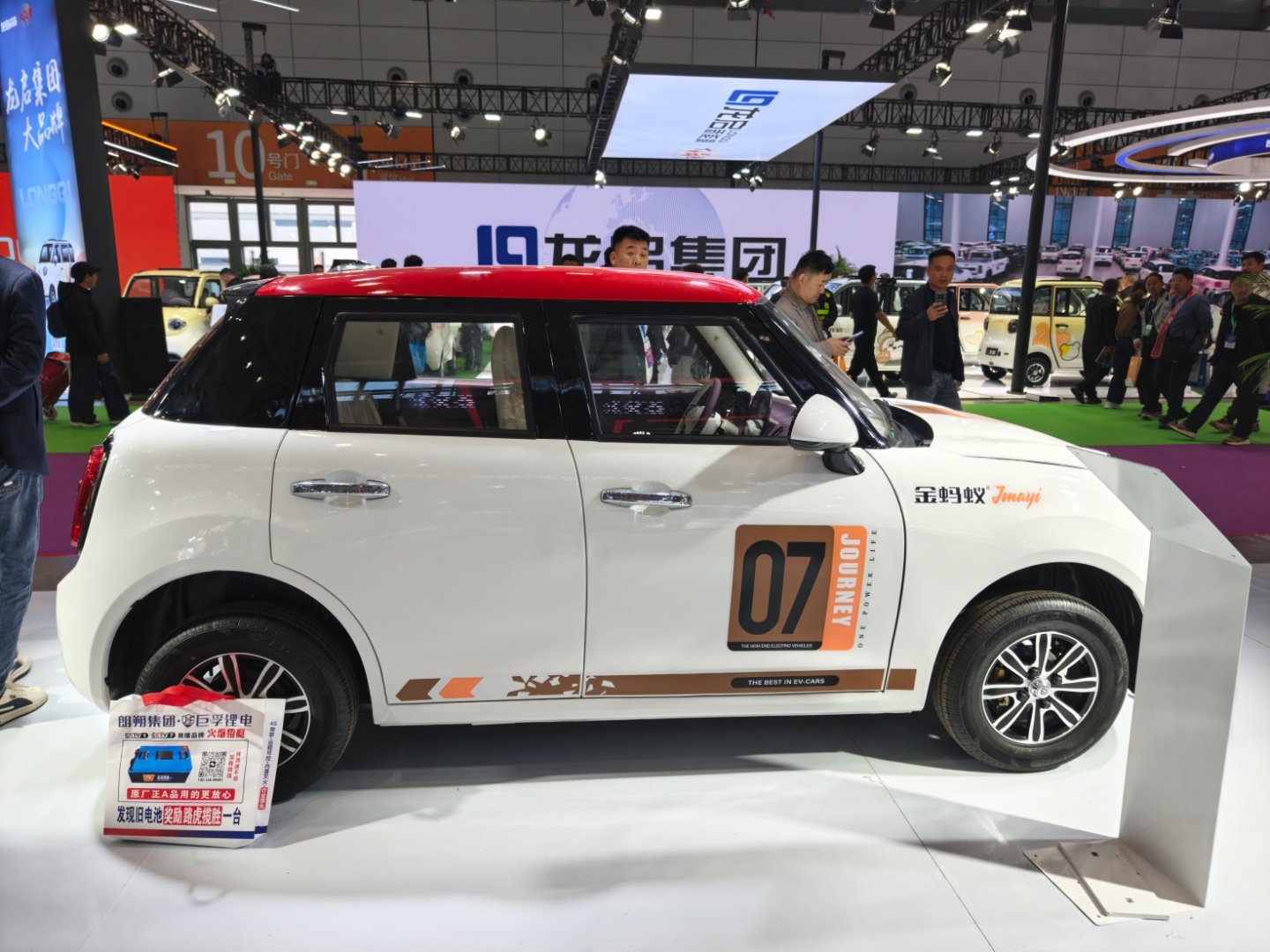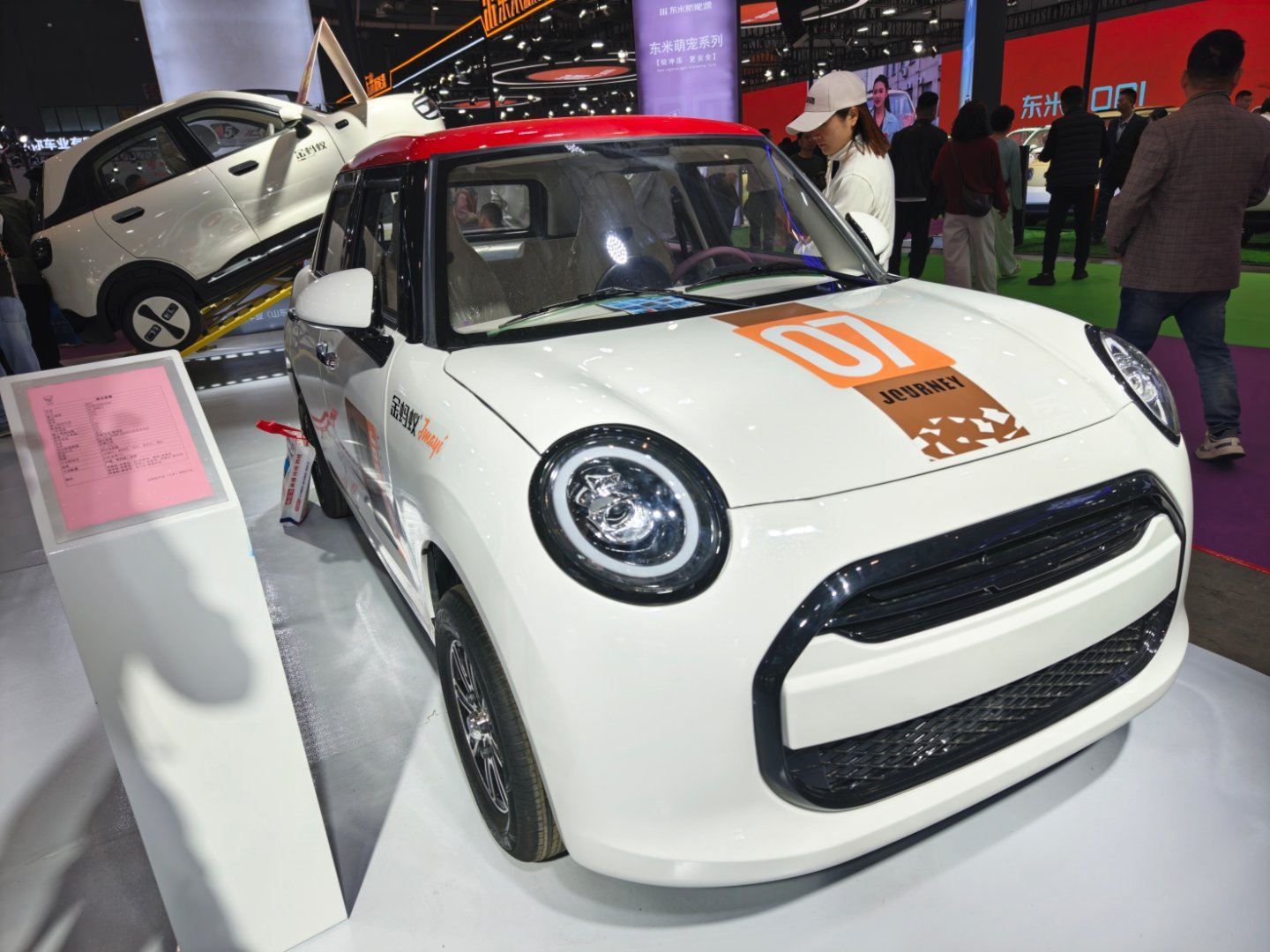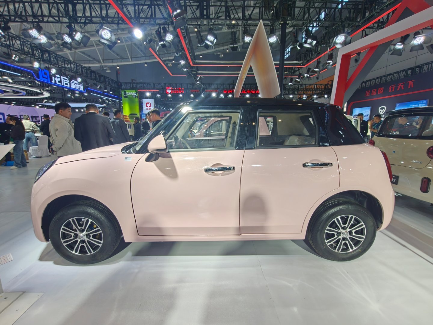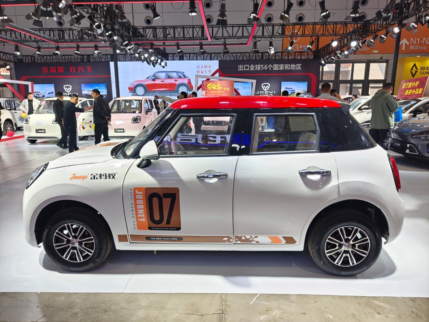 这个山寨的MINI纯电,写的是独家车型,一个是外形真的太像了,再次征服了我,开到路上你真的不一定能分清楚。第二个是内饰都复刻了,圆形的中控屏、出风口还有副驾驶的氛围灯设计,一个字:绝!