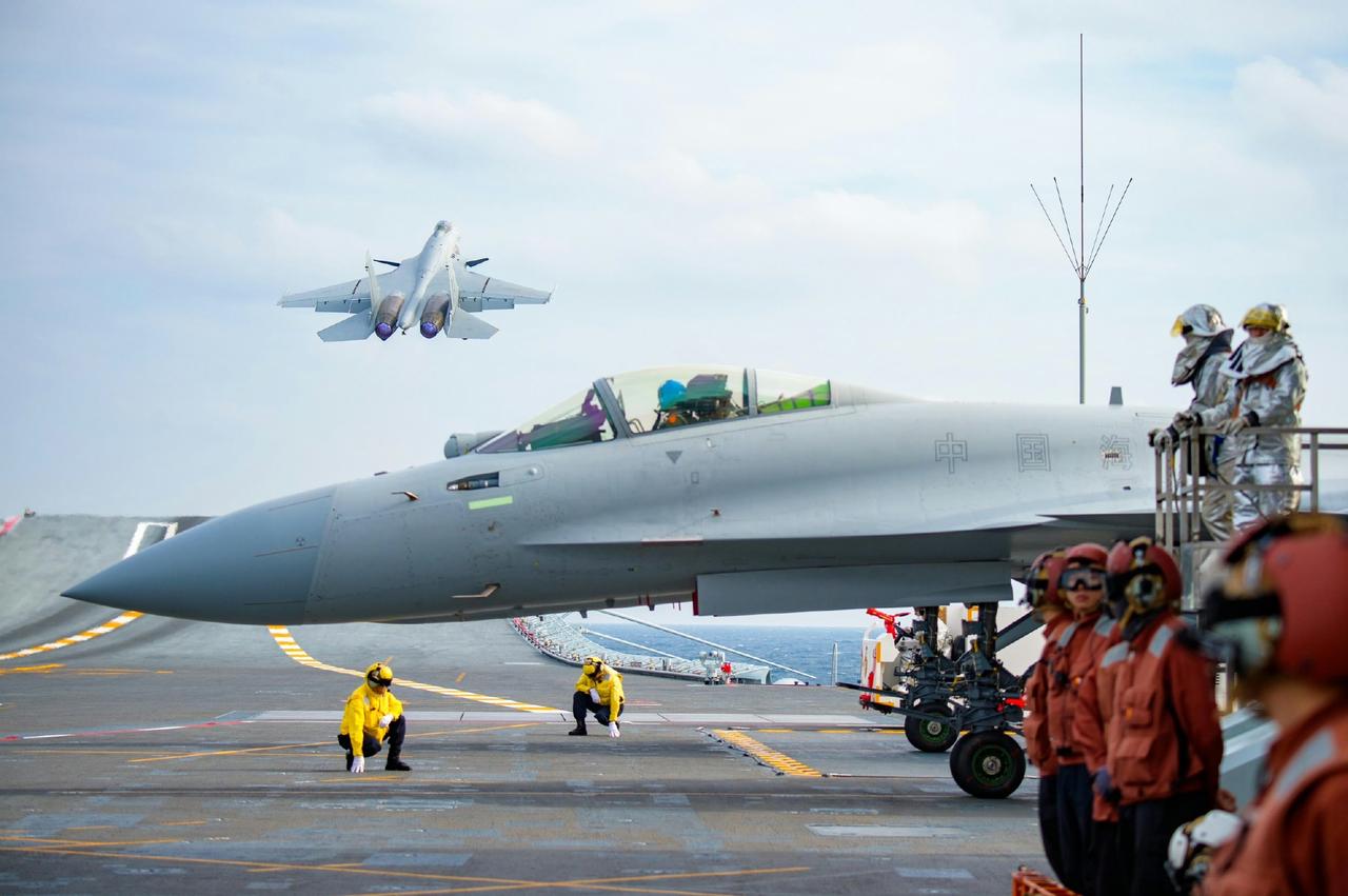 “山东”舰上的歼-15战斗机,1架起飞2架在待起飞区。注意这2架待起飞的都是带弹射拉杆的歼-15T,以后舰上就不存在基本型的歼-15了,都是可滑跃可弹射的T型以方便部署。