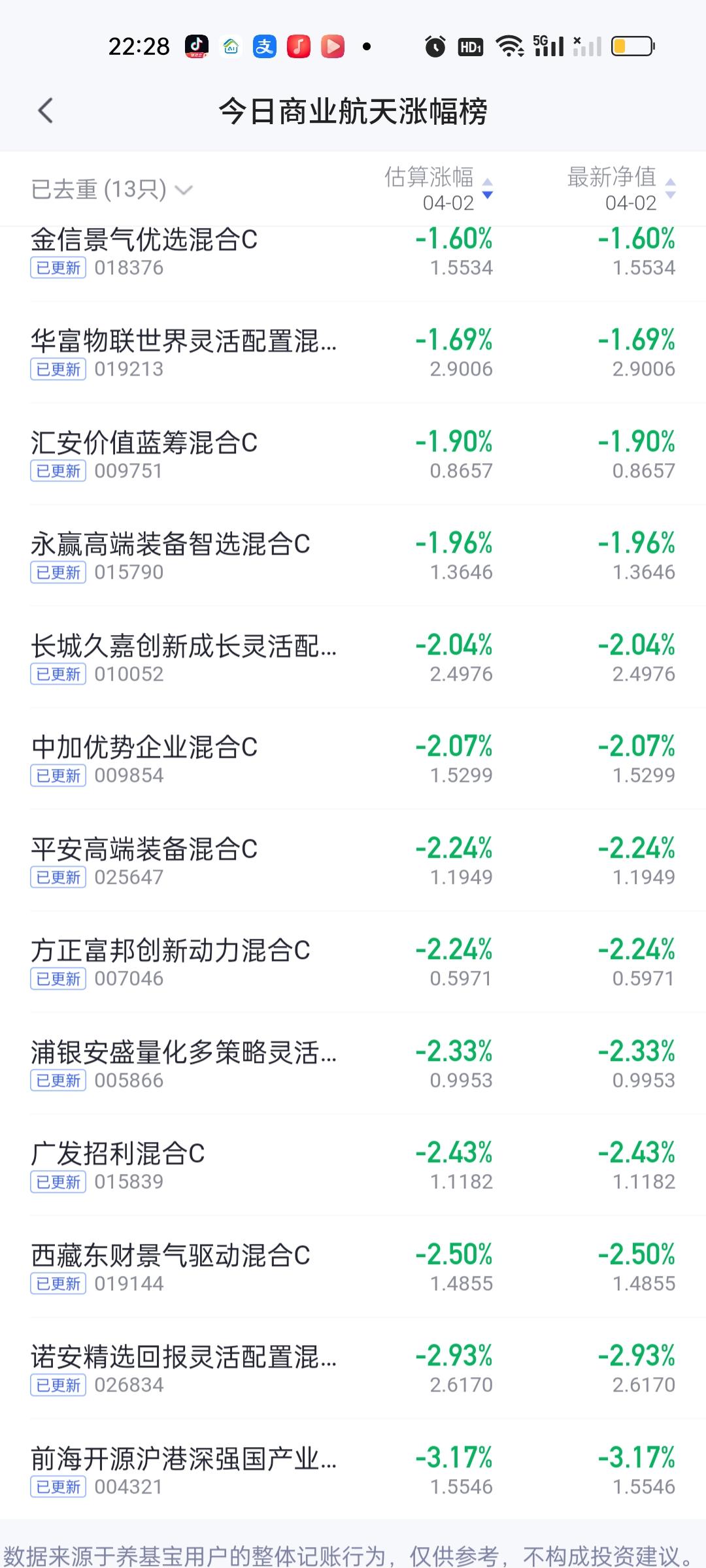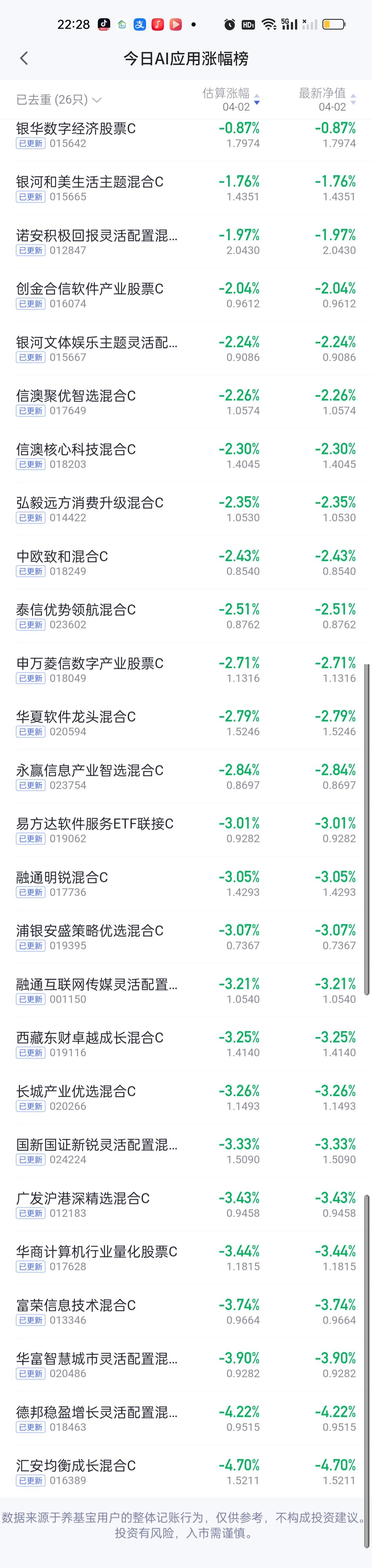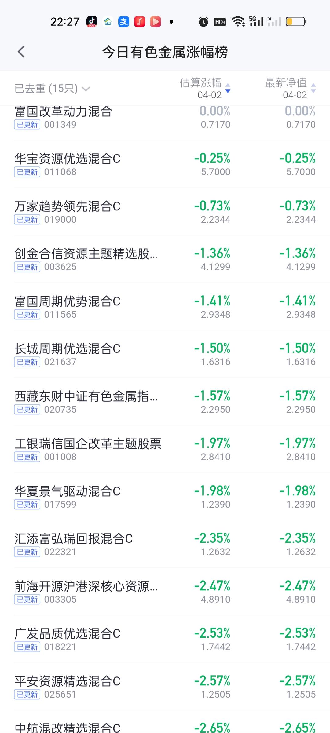 今日基金净值榜已全部更新完毕,涨幅方面,汇添富中证油气资源ETF联接3.79%排名第一,博时中证油气资源3.68%排名第二,国联品牌优选3.56%排名第三,中欧农业产业3.39%排名第四,银华农业产业3.20%排名第五,天弘中证油气产业指数3.01%排名第六。 跌幅方面,东方创新成长跌5.71%排名第一,金信核心竞争力5.48%排名第二,西部利得科技创新5.11%排名第三,东方阿尔法精选4.98%排名第四,汇安均衡成长4.70%排名第五,新华战略新兴产业4.66%排名第六。 有色金属,商业航天,AI应用,CPO,机器人,创新药涨幅榜一并奉上!