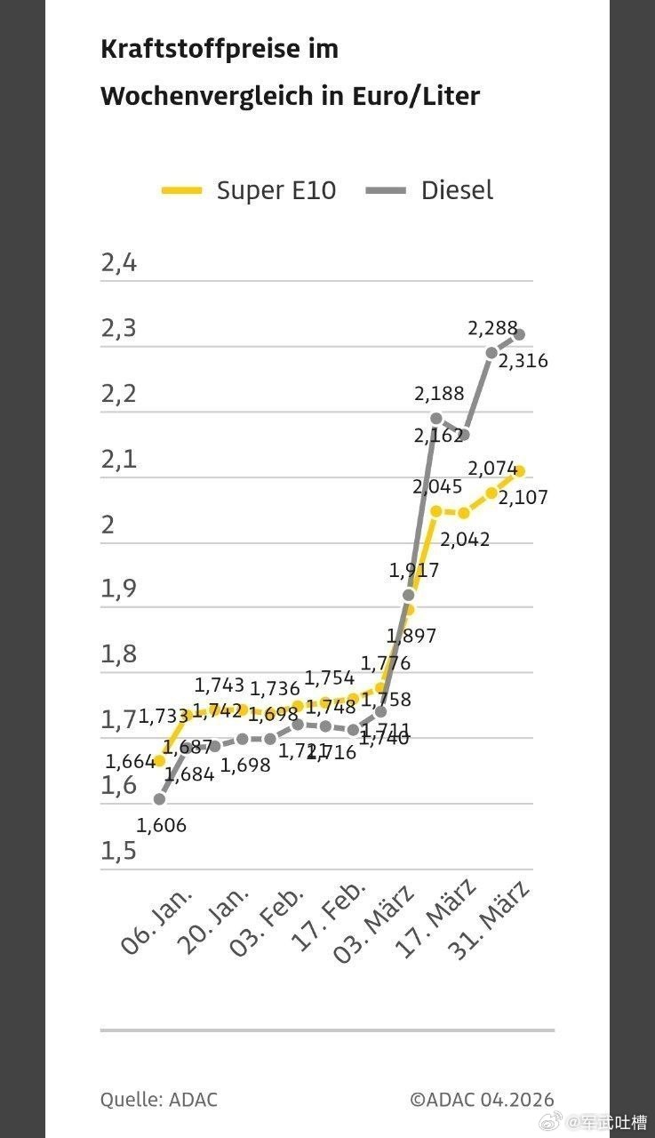 兄弟们,欧洲的好日子这不就来了吗?目前德国柴油价格已达到历史新高。根据德国汽车协会(ADAC)的数据,周三全国平均每升汽油价格为2.327欧元,超过了2022年3月创下的前纪录,汽油价格也上涨了,达到每升2.129欧元以前俄乌打仗,欧洲还可以买中东的能源现在中东打仗,欧洲只能买美国的能源美国人这时候不割韭菜,什么时候割?简直就是送上门的人头啊伊朗航空航天部队司令巡视地下导弹基地伊朗袭击美军隐秘据点致37人死亡美伊以冲突