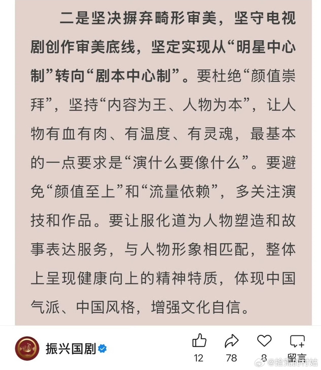 逐玉可以吹里程碑了,推动了电视剧改革。会议提到杜绝“颜值崇拜”,坚持“内容为王、人物为本”,让人物有血有肉、有温度、有灵魂,最基本的一点要求是“演什么要像什么”整体上呈现健康向上的精神特质,体现中国气派、中国风格,增强文化自信。电视剧健康审美座谈会