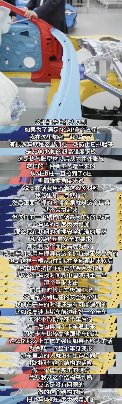 新一代SU7这个车我也算很熟,单纯论车身强度这块儿,2200MPa的超强钢还有底部防弹涂层以及圣诞树结构都是非常亮眼的车身设计,谁看了都要说用心。