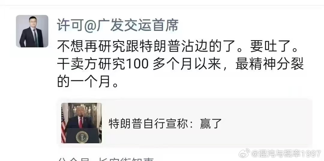 卖方:不想再研究跟特朗普沾边的了。要吐了。干卖方研究100多个月以来,最精神分裂的一个月。