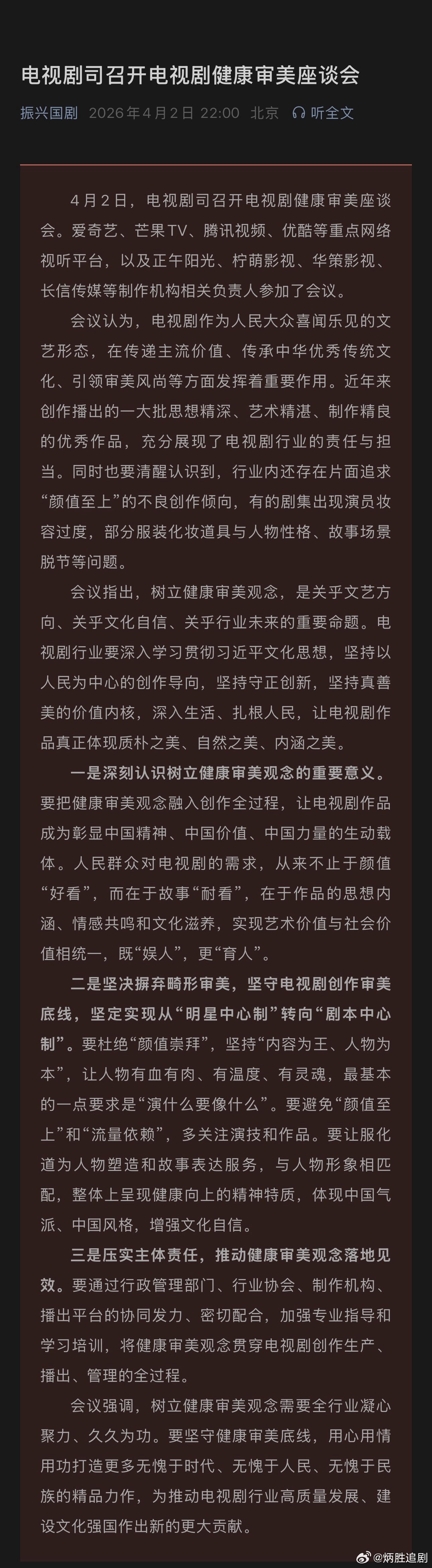 电视剧司召开电视剧健康审美座谈会:坚决摒弃畸形审美,坚守电视剧创作审美底线,坚定实现从“明星中心制”转向“剧本中心制”。要杜绝“颜值崇拜”,坚持“内容为王、人物为本”,让人物有血有肉、有温度、有灵魂,最基本的一点要求是“演什么要像什么”。要避免“颜值至上”和“流量依赖”,多关注演技和作品。