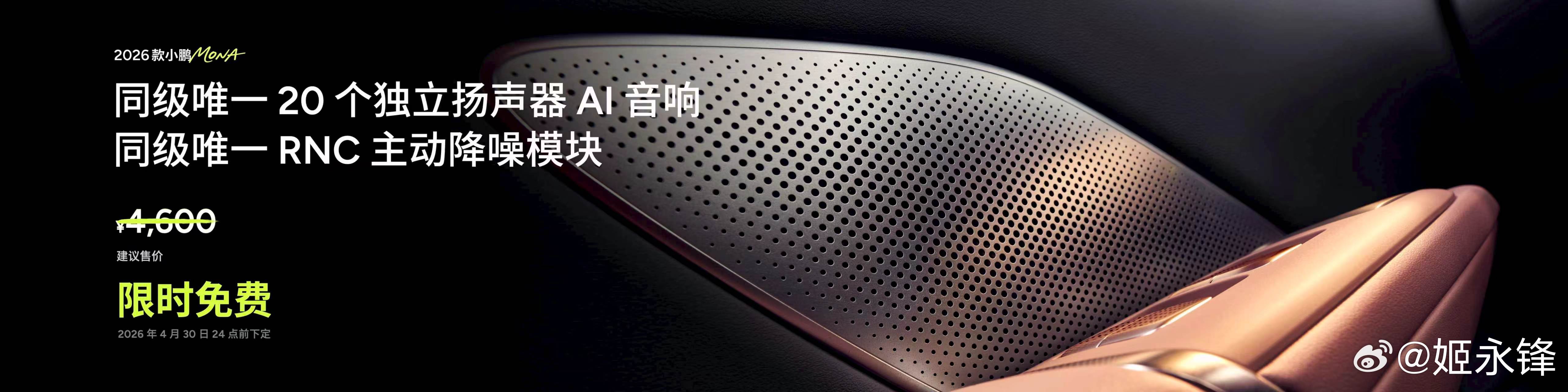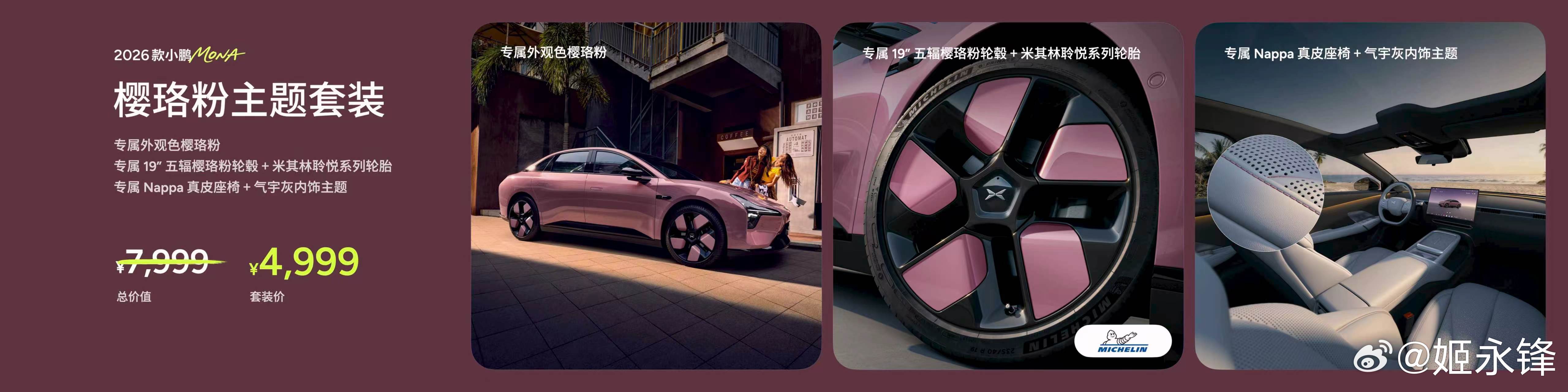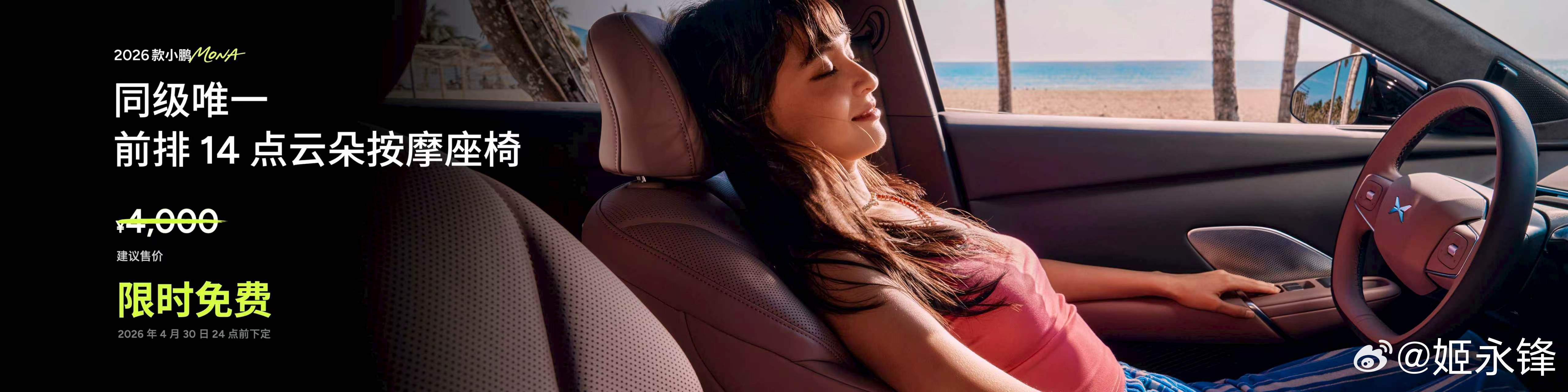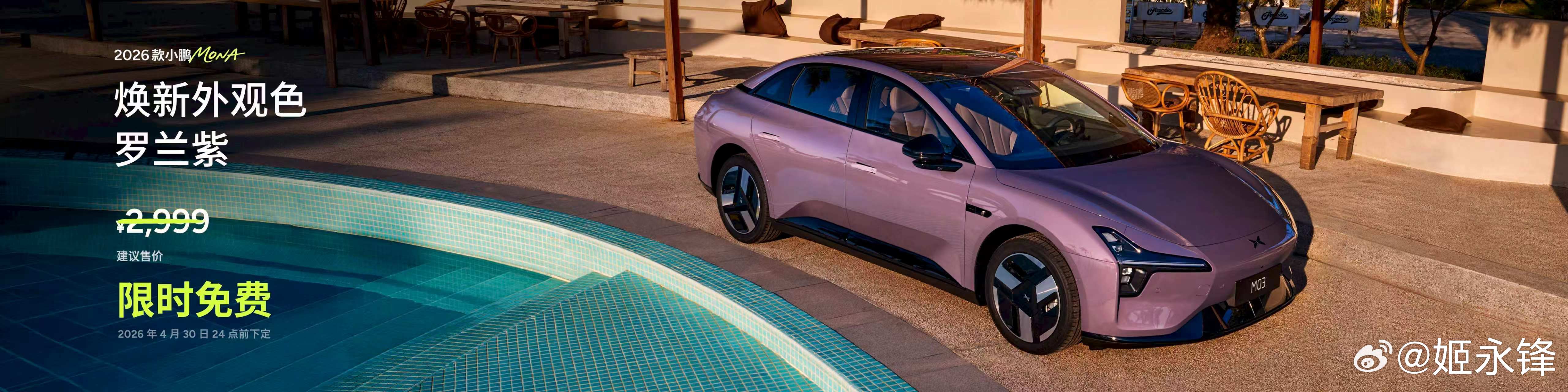 2026款小鹏MONA M03重磅首发权益,以满满诚意让年轻人轻松拥有心仪座驾。全新罗兰紫、牛油果绿两款高级质感车漆,原2,999元,限时免费;同级唯一20扬声器AI音响+RNC主动降噪,原4,600元,限时免费;同级唯一前排14点云朵按摩座椅,原4,000元,限时免费;米其林轮胎+运动轮毂套餐限时选装价仅4,000元;樱珞粉专属主题套装,原7,999元,限时仅4,999元;同步推出上市专属权益,即日起至2026年4月30日24点前下定2026款小鹏MONA M03,限时送至高价值超35,000元权益。欧阳娜娜同款小鹏MONA起售价11.98万2026款小鹏MONA大大大大大升级
