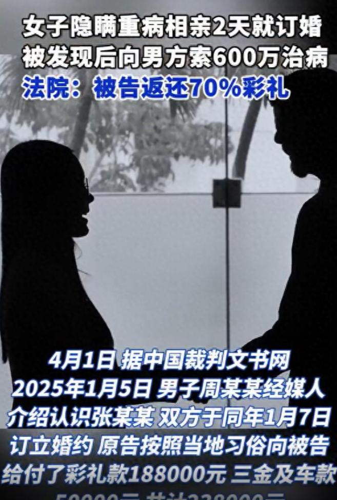 河南周口,男子经人介绍与一名女子相识,接触两天后就定下婚约,并为此支付给女方23.8万元,不料,刚刚在一起生活3个月,男子发现女友患有尿毒症,女方倒好,不但没道歉,还要男子贷款600万给她看病,男子想要好聚好散退回彩礼,女方说:不可能! 2026年2月的河南周口县城,街头巷尾的相亲风气依旧没变,媒婆们照旧忙着牵线说媒,不少年轻人还是按着老家的老规矩,匆匆见面、仓促定亲,日子仿佛一直按着旧节奏往前走,很少有人会留意,当地的法律文书库里,一份早已归档的判决书,默默记下了一场因仓促订婚、隐瞒病情引发的彩礼纠纷,也给不少急于成家的人提了个醒。 事情要回到2025年初,在不少农村地区,相亲订婚的节奏向来偏快,可这起婚事的速度,算得上格外极端,周口当地的男子周某某,经家里亲戚牵线,认识了女子张某某,两人见面接触仅仅两天,没来得及深入了解彼此,就匆匆定下了婚约。 在老家定下婚事就要拿出彩礼,这是沿袭多年的习俗,周某某也按照规矩,给女方凑足了23.8万元,其中包含18.8万元的彩礼钱,还有5万元用于购置三金和车辆的款项,一笔笔钱交出去,两人紧接着就办了婚礼,开始同居生活,只是一直没有去民政局办理正式的结婚登记。 本以为是安稳日子的开端,可这段仓促的婚姻,只维持了短短三个月就彻底变了味,相处期间周某某渐渐发现女方身体不对劲,仔细了解后才得知,对方一直患有尿毒症,除此之外还伴有多种严重的并发症,身体状况极差,这本就给了周某某当头一棒,更让他难以接受的是,女方非但没有坦诚过错,反而直接要求他去贷款600万元,用来给自己治病。 600万对于普通家庭来说,无疑是天文数字,就算是工薪阶层,不吃不喝打拼几十年也攒不下这笔钱,周某某根本没有能力满足这样的要求,看着这段满是欺骗的关系,他不想再纠缠下去,只想和平分开,让女方退还之前给出的大额彩礼及时止损,可面对他的合理诉求,女方态度十分强硬,直接回绝了退彩礼的想法,丝毫没有商量的余地。 没过多久女方就因病昏迷,被紧急送往太康县人民医院救治,检查结果出来后,诊断出多项重症,除了尿毒症,还有严重的糖尿病、高血压以及多种并发症,身体状况早已不适合仓促成婚。 周某某想找对方家人协商解决此事,可微信消息发过去直接被拒收,自己也被对方拉黑,彻底断了联系,无奈之下,他只能走法律途径维权。 案子经过法院审理,最终给出了判决结果,判令女方返还彩礼166600元,23.8万的彩礼,最终只拿回了七成左右,并不是法院随意裁量,而是结合实际情况做出的公正判决。 按照法律规定,两人没有办理结婚登记,彩礼原则上应当返还,但两人毕竟同居生活了三个月,期间产生了真实的生活开支,再加上女方确实身患重病,后续治疗需要花销,这些因素都被折算在内,最终定下了返还的数额。 这场闹剧收场,说到底根源还是两人过于仓促的决定,以及严重的信息不对称,在当地不少人的婚恋观念里,相亲后快速定亲是常态,慢慢相处、仔细考量反而会被旁人议论挑剔,觉得挑三拣四不靠谱,周某某的遭遇并不是个例,而是当下部分农村相亲乱象的一个缩影,这场看似快捷的婚事,终究变成了一场代价惨重的赌局。 周某某拿回16万余元的彩礼,看似挽回了部分损失,可他付出的代价远不止这些,三个月的虚假婚姻,带来了难以抹平的情感伤害,二十多万的资金占用,也耽误了自己的生活。 如今周口的街头,媒婆的说媒声依旧没有停歇,可这场用真金白银买来的教训,值得很多急于成家的年轻人深思,婚姻从来不是赶进度的交易,多一份了解,多一份慎重,才能避开这样的深坑。