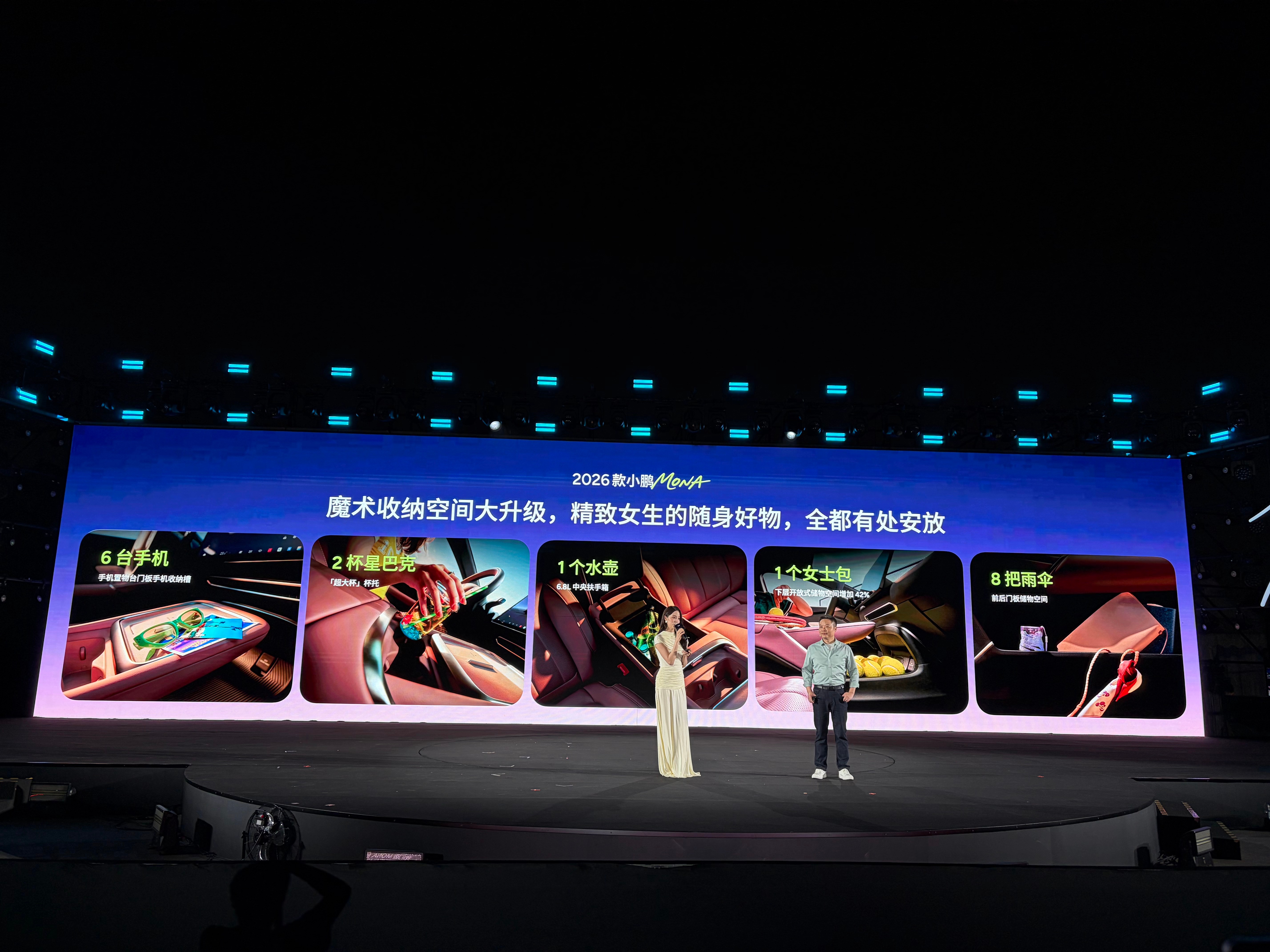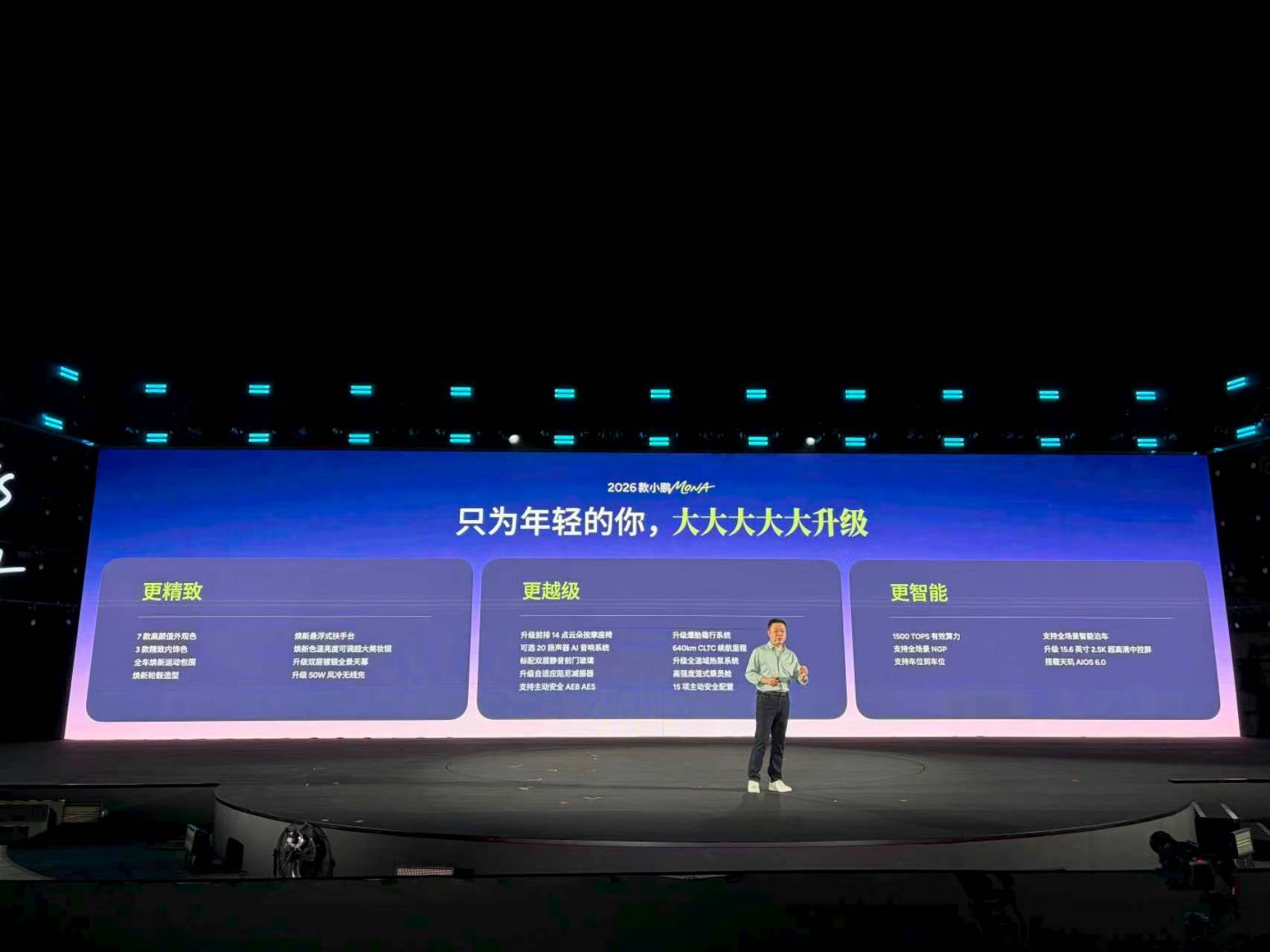 升级的东西真不少,双层镀银全景天幕,化妆镜色温亮度都可调节,头枕音响、前排双层夹胶玻璃、后排氛围灯、主动降噪、50W无线充电、自适应阻尼减振器等。Max版单颗750 TOPS图灵芯片,Ultra SE双芯1500 TOPS,官宣第三季度推送第二代VLA蒸馏版。这波升级主打听劝,融进欧阳娜娜和车主的一些建议,让驾驶更轻松,用车更踏实。2026款小鹏MONA今日上市