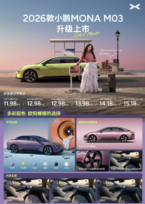 2026款小鹏MONA大大大大大升级 2026款小鹏MONA M03上市,共推出6款版型,罗兰紫、牛油果绿、20个独立扬声器、前排两个14点云朵按摩座椅限时免费赠送,官方指导价: