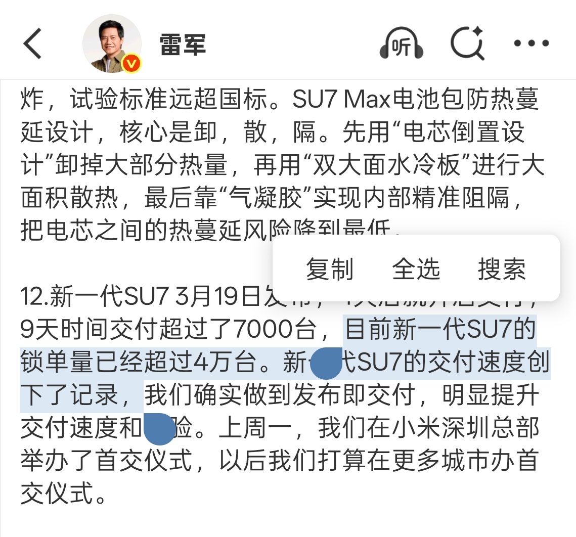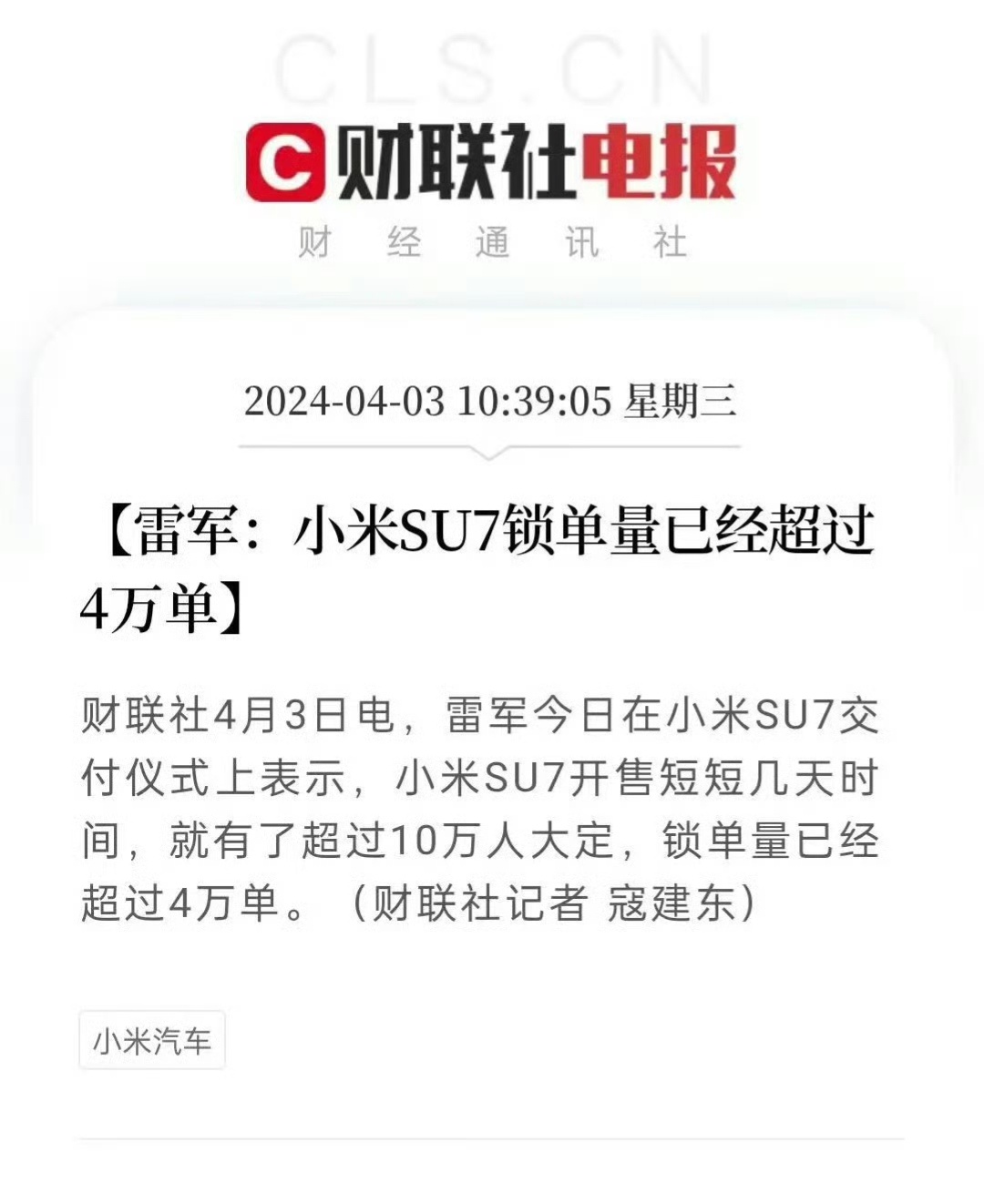 新一代SU7锁单超4万辆 雷总在今晚直播中宣布,新一代SU7锁单超4万辆,速度真快啊。