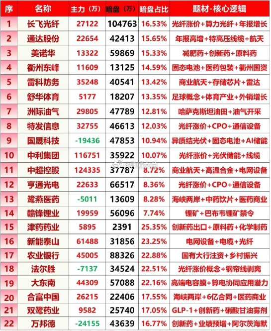 个股精简(核心数据 + 逻辑)长飞光纤:流入 2.71 亿 / 暗盘 10.48 亿,光通信龙头,光纤涨价 + 年报增长通达股份:流入 2.27 亿 / 暗盘 4.24 亿,特高压 + 航天,年报高增美诺华:流入 1.33 亿 / 暗盘 5.99 亿,减肥药 + 创新药 + 原料药衢州东峰:流入 1.16 亿 / 暗盘 1.31 亿,固态电池 + 医药包装 + 国资雷科防务:流入 3.52 亿 / 暗盘 4.05 亿,商业航天 + 存储芯片 + 雷达舒华体育:流入 0.52 亿 / 暗盘 1.82 亿,足球概念 + 外销增长洲际油气:流入 2.98 亿 / 暗盘 4.78 亿,油气开采,海外油田特发信息:流入 3.28 亿 / 暗盘 4.66 亿,光纤涨价 + CPO + 通信国晟科技:流出 1.94 亿 / 暗盘 4.79 亿,光伏 + 固态电池 + 储能,逆势吸筹中利集团:流入 11.68 亿 / 暗盘 3.59 亿,光纤 + 光伏储能中超控股:流入 12.43 亿 / 暗盘 3.78 亿,航天 + 高温合金 + 电网亨通光电:流入 2.26 亿 / 暗盘 6.65 亿,光通信龙头,CPO 核心鹭燕医药:流出 0.50 亿 / 暗盘 1.36 亿,医药商业,暗盘吸筹赣锋锂业:流入 2.00 亿 / 暗盘 5.61 亿,锂矿 + 海外资源禁令津药药业:流入 0.59 亿 / 暗盘 0.24 亿,创新药出口,暗盘占比最高新能泰山:流入 6.15 亿 / 暗盘 3.19 亿,电网 + 光纤,双主线农业银行:流入 4.50 亿 / 暗盘 8.83 亿,大金融,防御核心法尔胜:流出 0.71 亿 / 暗盘 3.45 亿,光纤概念,逆势吸筹大东南:流入 4.43 亿 / 暗盘 5.71 亿,电容膜 + 算电协同 + 固态电池合富中国:流入 2.62 亿 / 暗盘 2.24 亿,医药 + 6 亿合同双鹭药业:流入 0.96 亿 / 暗盘 2.57 亿,GLP-1 减肥药 + 创新药万邦德:流出 2.42 亿 / 暗盘 4.36 亿,创新药 + 业绩预增,逆势吸筹
