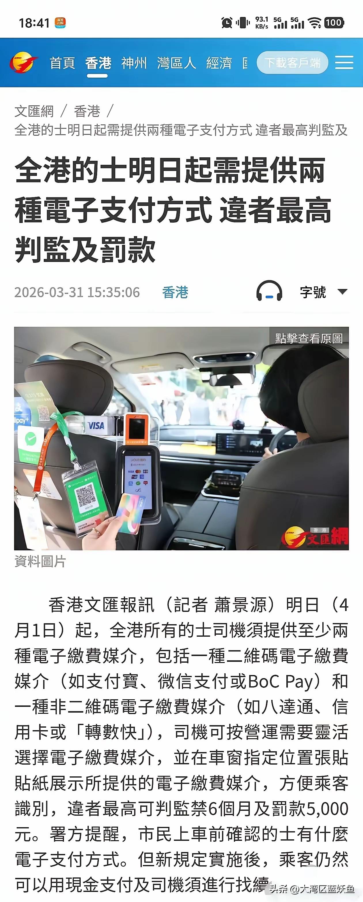 香港的士电子支付新规,跟上时代步伐啦 2026年,香港在电子支付方面有了大动作哦。4月1日起,全香港的士都得安装电子支付啦,像微信、支付宝这些都能用上,同时也没取消纸币支付,还是很人性化的。要是司机不照做,最高能判监6个月或者罚款5000港币呢。 这新规一出来,那真是好评如潮啊。不少乘客都觉得太方便了。以前去香港打车,得专门换好现金,要是忘了换,那可就麻烦了,还好有时候能遇到好心司机免费载一程,但这也不是长久之计呀。现在好了,电子支付一普及,不用担心假币问题,也不用为找零烦恼,而且还能在支付平台领优惠券呢,简直一举多得。 对于司机来说,同样好处多多。有开了18年出租车的司机就说,以前最怕收到一堆零钱,晚上回家数到手痛,现在一看手机就知道赚了多少,连去银行排队存钱的时间都省了。电子支付不仅提升了交易效率,还能让交易记录更清晰,万一有个纠纷啥的,也好查证。 不过呢,新规实施也有些小插曲。比如有个别电子支付平台会收取3%的手续费,这就需要乘客在支付前了解清楚,选择合适的支付方式了。还有司机反映信用卡手续费较高,部分乘客又坚持要用信用卡,这也是后续需要解决的问题。 但总体来看,香港推行这个的士电子支付新规,是真的在跟上内地步伐呀。在内地,电子支付早就普及得很广泛了,无论是大城市还是小县城,出门不带现金基本都能搞定一切。香港这次强制推行,虽然有人觉得有点“狠”,但有些事情确实得强制去做,才能推动社会发展进步嘛。就像以前垃圾分类,一开始大家也觉得麻烦,可强制实施后,环境不就变好了吗? 香港作为国际大都市,提升交通领域的电子支付水平,不仅能方便本地居民,还能让游客有更好的体验,对提升城市形象也有帮助呢。相信随着新规的持续实施,这些小问题会逐渐解决,香港的智慧城市建设也会迈出更坚实的步伐啦。