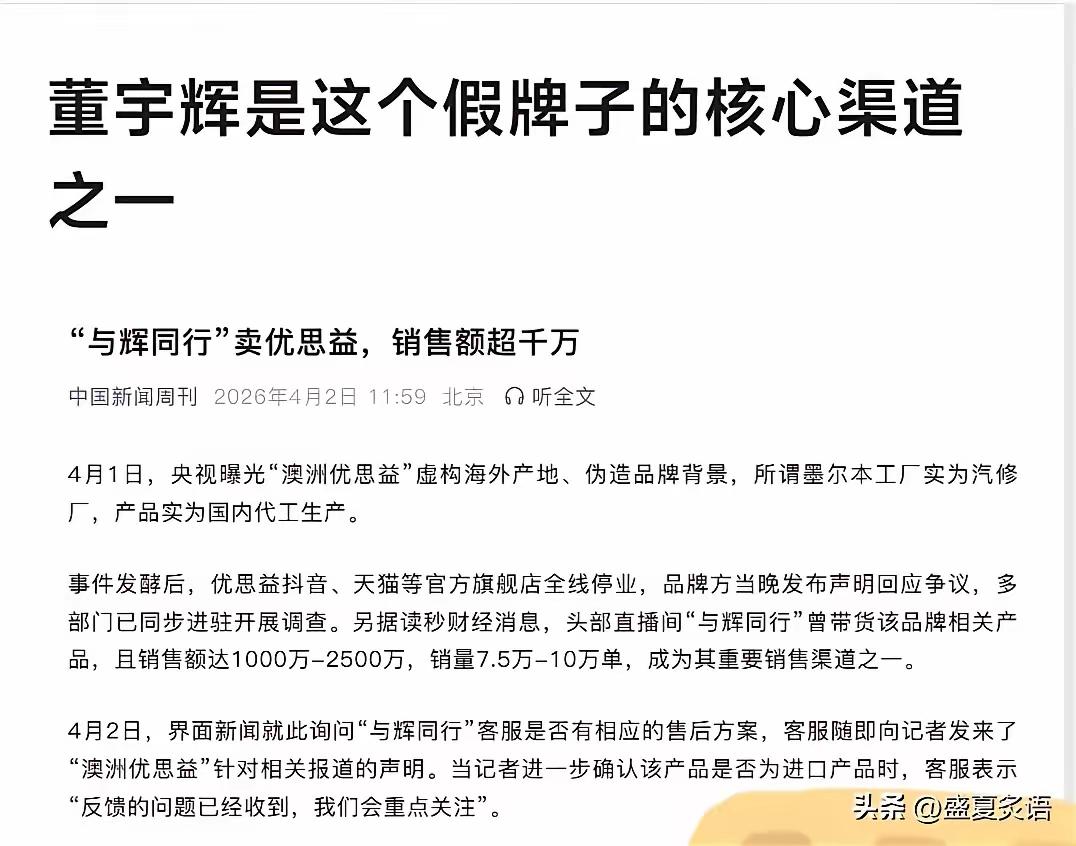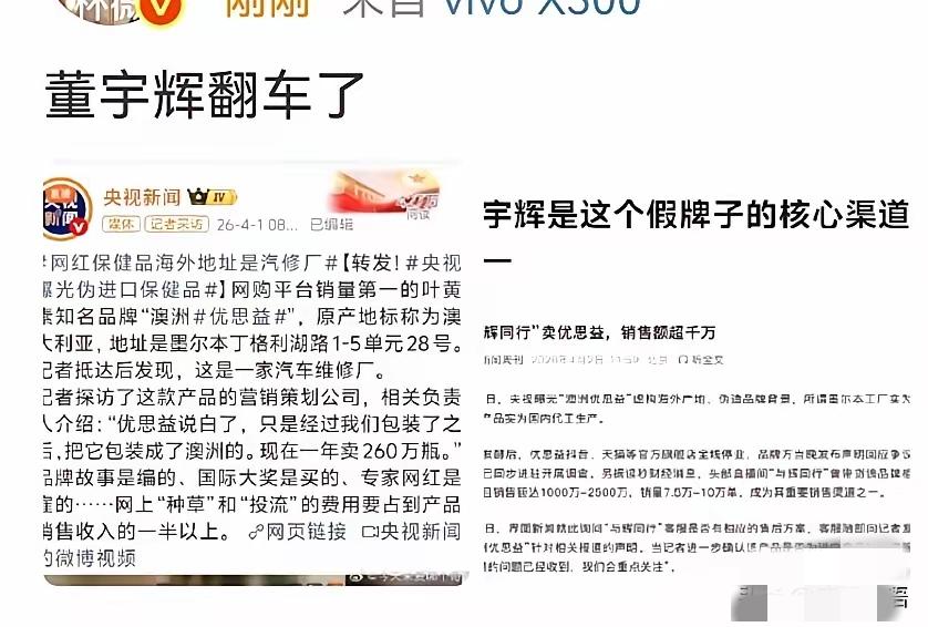 4月2日董宇辉翻车了!他上了热搜他居然卖假货!这份用信任,用真诚攒下的口碑呀! 谁能想到,董宇辉的直播间里,却卖被央视点名造假的产品。 这一款是网购平台销量第一的叶黄素知名品牌澳洲“优思益”品牌。 这个品牌,包装上写着产地是澳大利亚。 地址是墨尔本丁格利湖录1-5单元28号。 真是高大上的产品。 可是,事实又是什么呢? 事实就是,生产地址是一家汽车维修厂。 当记者问起这款产品营销策划公司的时候。 负责人说:这优思益,说白了,这是经过我们包装了之后,把它包装成澳洲的,现在一年卖260万瓶。 负责人还说:品牌故事是编的,国际大奖是买的,专家网红是雇的。 这不说不知道,一说吓一跳。 看看这负责人说的,都是假的,假的,假的。 一年卖260万瓶,不敢想啊。 他们怎么敢这么干呀? 虚构海外产地,伪造品牌背景, 什么墨尔本,什么澳大利亚。 实地是国内的汽车维修厂,国内代工生产。 这可是妥妥的“假洋牌子”呀! 他们把在安徽代加工的,成本只有20元的产品,卖上了高大上的价格。 20元的成本卖到300到400多元,利润15倍到20倍。 董宇辉旗下的“与辉同行”直播间,曾为优思益创造了1000万到2500万的销售额,卖出了7.5万到10万单,占该品牌总销量的近40%。 董宇辉真能卖货,就是卖货的能手,头部大拿。 可是,这一次他严选不严,信任度有些下降。 有多网友都在问董宇辉:你的直播间,还能相信吗? 不过,这一次不管董宇辉翻车。 塌房翻车的人很多。 有李若彤,王小骞,伊能静,章小蕙,都曾经卖过这优思益。 不过,这些明星,有的人已经开始公开道歉。 除了公开道歉,他们承诺给消费者退款。 为了高利益,高回报,有的人已经不讲究质量的好坏了吗? 看来,还是监管部门监管的太少了。 我们看看后续,看看我们曾经信任的董宇辉,这一次应该怎样公关塌房翻车事件。 董宇辉这一次