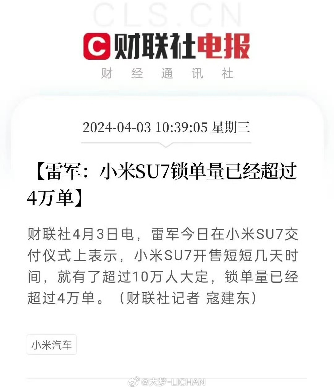 新一代SU7锁单超4万辆