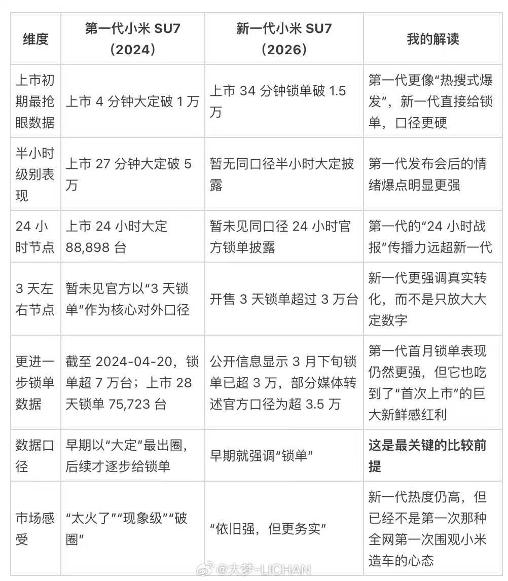 第一代SU7爆发力很强,某种程度上是现象级表现,外界看的就是三个事:小米第一次卖车、雷军IP的关注度、以及市场想验证小米到底能不能把车卖爆。