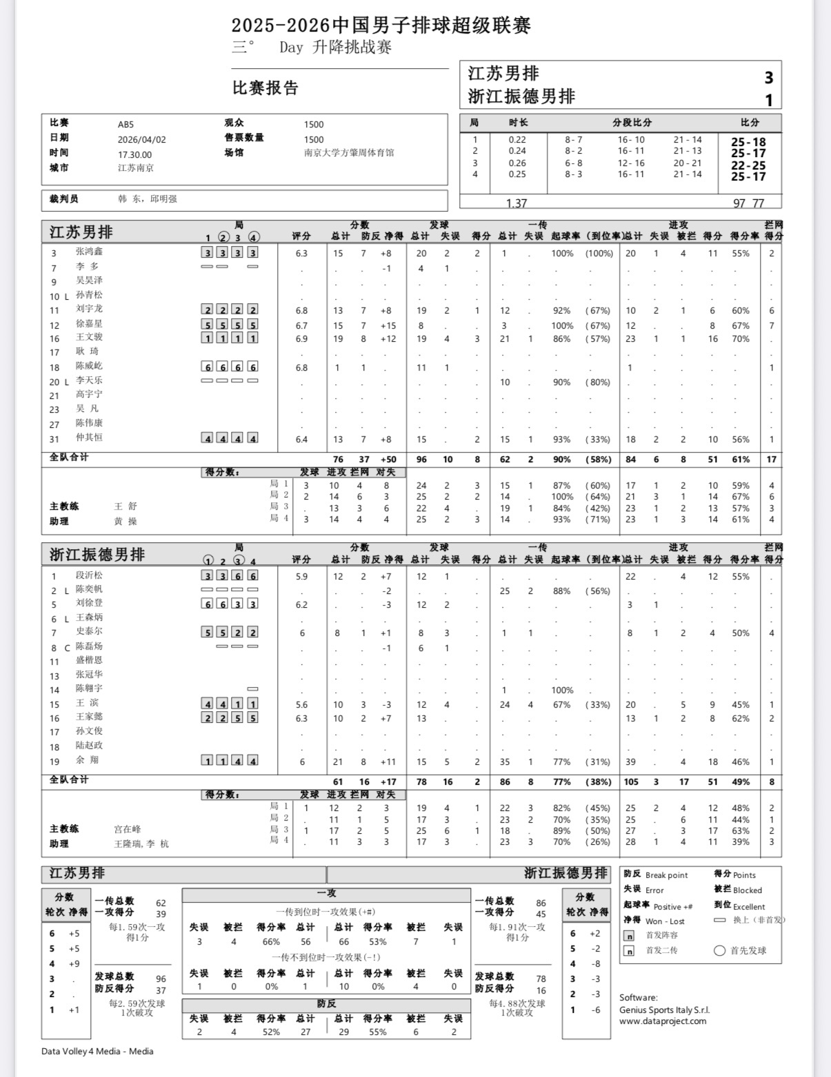 2025-2026中国男排超级联赛 男排联赛升降级赛:浙江男排1-3不敌江苏男排无缘下赛季A级(18-25,17-25,25-22,17-25)。余翔21分(39扣18中4被拦,1拦2发),段沂松12分(22扣12中4被拦),王滨10分(20扣9中5被拦,1拦),王家懿10分(13扣8中1失误2被拦,2拦),史泰尔8分(8扣4中 1失误2被拦,4拦)。王文骏19分(23扣16中1失误1被拦,3发),徐嘉星15分(12扣8中,7拦),张鸿鑫15分(20扣11中1失误4被拦,2拦2发),刘宇龙13分(10扣6中2失误1被拦,6拦1发),仲其恒13分(18扣10中2失误2被拦,1拦2发),陈威屹1分。扣球51-51,拦网8-17,发球2-8,自失21-16。