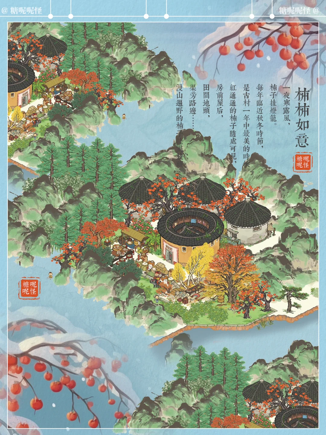 一夜寒露风,柿子挂灯笼。 每年临近秋冬时节, 是古村一年中最美的时候。 红通通的柿子随处可见, 房前屋后,田间地头,渠旁路边…… 漫山遍野的柿子挂满枝头……