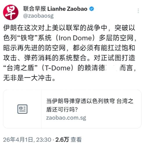 新加坡联合早报昨晚(4月1日晚)写道:“当伊朗导弹穿透以色列铁穹,台湾之盾还可行吗? 先跟大家说清楚,什么是以色列的“铁穹”。铁穹是以色列专门研发的防空系统,用来拦截火箭弹、短程导弹和无人机,这些年在巴以冲突里经常被提起,以色列也一直吹嘘它多先进,说能拦住绝大多数来袭目标。 而且以色列的防空网不只有铁穹,还有“大卫投石索”对付中程导弹,“箭”式系统应对远程导弹,三层防护,号称全球最严密的防空体系之一。 但这次伊朗反击美以联军,直接打破了这个神话。伊朗发射的导弹,硬生生穿透了这套多层防空网,击中了以色列的多个目标,连以色列自己的媒体都承认,伊朗导弹的命中率高达80%。 有人可能会问,这么先进的铁穹,怎么就拦不住了?核心问题就两个:一是扛不住饱和攻击,二是弹药消耗不起。 伊朗这次采取的战术很直接,就是集中发射大量导弹和无人机,让以色列的防空系统应接不暇。铁穹虽然能同时拦截多个目标,但它的火力通道有限,面对密密麻麻的来袭目标,系统根本处理不过来,只能眼睁睁看着部分导弹突破拦截。 更关键的是,拦截弹的消耗速度远远超过补给速度,以色列的“箭-3”拦截弹库存都快耗尽了,而这种拦截弹生产周期要18到24个月,短时间根本补不上。 更现实的是,拦截弹的成本远高于来袭导弹。铁穹的一枚拦截弹要5到10万美元,“箭-3”更是超过300万美元,而伊朗用的很多是低成本的无人机和导弹,相当于用便宜的“炮弹”,耗光了以色列昂贵的“盾牌”,这种消耗战,以色列根本扛不住。 而且伊朗还摧毁了以色列的多套前沿预警雷达,相当于挖掉了防空系统的“眼睛”,拦截效率大幅下降,这也是铁穹失灵的重要原因。 说完铁穹,再说说赖清德当局要搞的“台湾之盾”。其实这东西根本不是什么新发明,就是抄了以色列铁穹和美国“金穹”的概念,说白了就是把台湾现有的各种防空导弹,整合到一个指挥系统里,号称能拦截来袭目标,保护台湾的安全。 但大家只要稍微想想就知道,这根本行不通。首先,台湾的防空系统本身就乱七八糟,有从美国买的“爱国者”导弹,有自己研发的“天弓”系统,还有即将接收的NASAMS系统,这些系统来自不同的国家和团队,指挥系统、雷达、导弹都不兼容,要把它们整合到一起,以台湾的技术水平,根本做不到。 赖清德当局也知道自己没这个能力,所以有消息说,他们已经派“密使”去以色列,想找以色列帮忙,毕竟以色列有研发铁穹的经验。 但以色列和台湾没有正式的外交关系,就算敢偷偷输送技术,也不敢明目张胆地帮忙,而且这种合作一旦被发现,会遭到中国大陆的强烈反对,以色列根本得不偿失。 退一步说,就算台湾真的把“台湾之盾”搞起来了,也跟以色列的铁穹一样,经不起实战考验。台湾的面积小、纵深浅,防空系统只能集中部署,一旦遭到饱和攻击,根本没有缓冲的空间。而且台湾的拦截弹全靠进口,库存有限,一旦打起来,根本无法快速补充,用不了多久就会耗尽,到时候所谓的“盾牌”,就成了摆设。 更重要的是,赖清德搞“台湾之盾”,根本不是为了保护台湾民众,而是为了自己的政治利益。他们大肆鼓吹“台湾之盾”,一方面是想渲染“大陆威胁论”,塑造自己“强硬护台”的形象,拉拢选票;另一方面,是想通过购买武器、打造系统,向美国和以色列示好,换取外部势力的支持,推进“台独”分裂活动。 大家可以算一笔账,打造“台湾之盾”需要巨额资金,有测算说至少要200多亿美元,这些钱都是台湾民众的税金,本来可以用来改善医疗、教育、民生,却被赖清德当局砸在这种没用的东西上。 而且台湾之前买美国武器,经常被“敲竹杠”,这次要是找以色列合作,大概率又是一笔“冤大头”交易,最后只会掏空台湾的财政,让民众吃苦。 伊朗导弹穿透铁穹,已经给赖清德当局敲响了警钟:再先进的防空系统,也扛不住饱和攻击和弹药消耗,更挡不住统一的步伐。 台湾是中国不可分割的一部分,这是铁的事实,不管赖清德当局花多少钱,搞多少所谓的“盾牌”,都改变不了这个事实,也挡不住中国人民解放军捍卫国家主权和领土完整的决心。 说白了,赖清德的“台湾之盾”,就是一个用来忽悠民众、捞取政治资本的空口号,是一个烧钱不顶用的摆设。真到了关键时刻,它既保护不了台湾民众,也救不了“台独”分子,只会把台湾拖入兵凶战危的境地,最终损害的还是台湾民众的根本利益。
