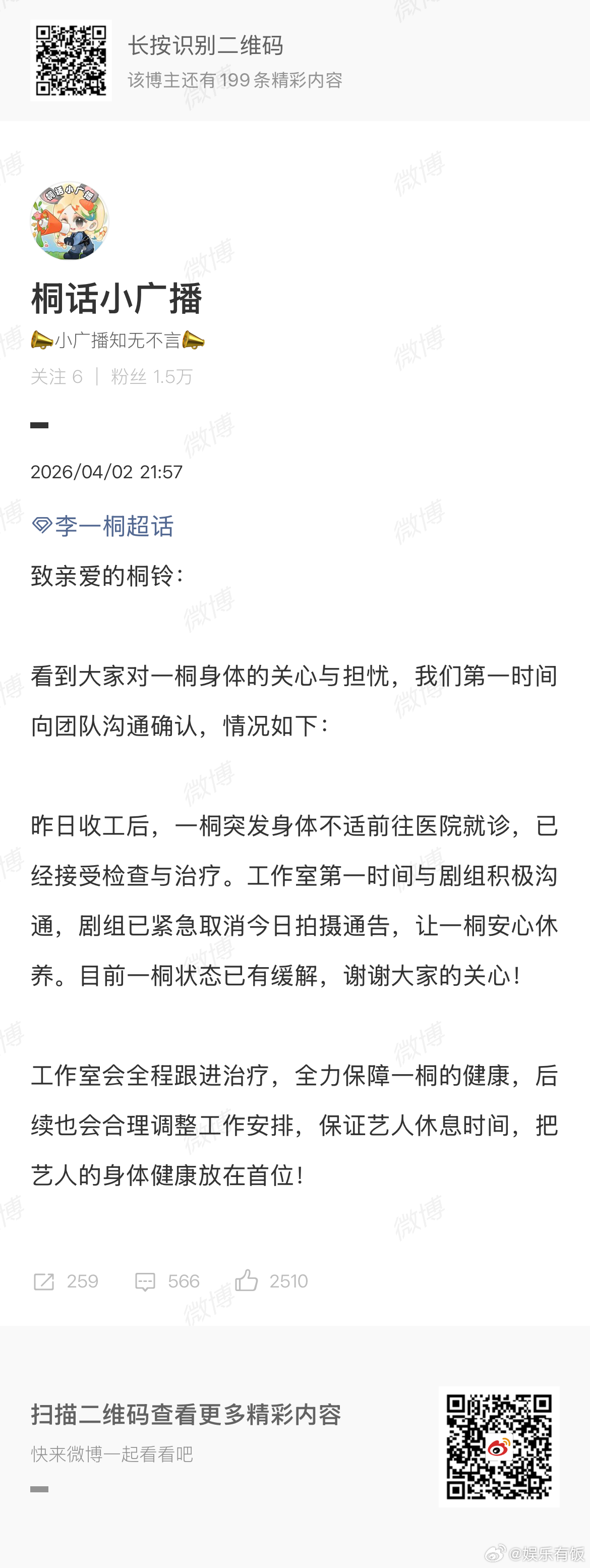 对接回应李一桐夜晚进急诊对接回应网友医院急诊偶遇李一桐 近日有网友透露夜晚在医院急诊偶遇李一桐,图片中显示李一桐穿着睡衣、被人搀扶着进了急诊。4月2日晚,李一桐对接回应此事,透露李一桐于前一晚收工后突发身体不适前往医院就诊,已经接受检查与治疗,“剧组已紧急取消今日拍摄通告,让一桐安心休养,目前一桐状态已有缓解”、“工作室会全程跟进治疗,全力保障一桐的健康,后续也会合理调整工作安排,保证艺人休息时间,把艺人的身体健康放在首位!”好好休息,早日康复啊!